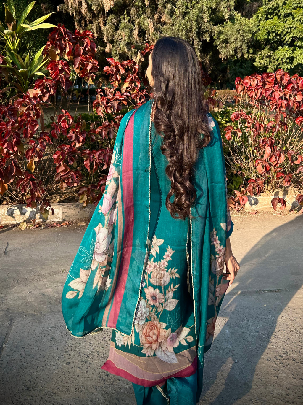 Teal Green Printed Jute-Organza Embroidered Unstitched Suit Set