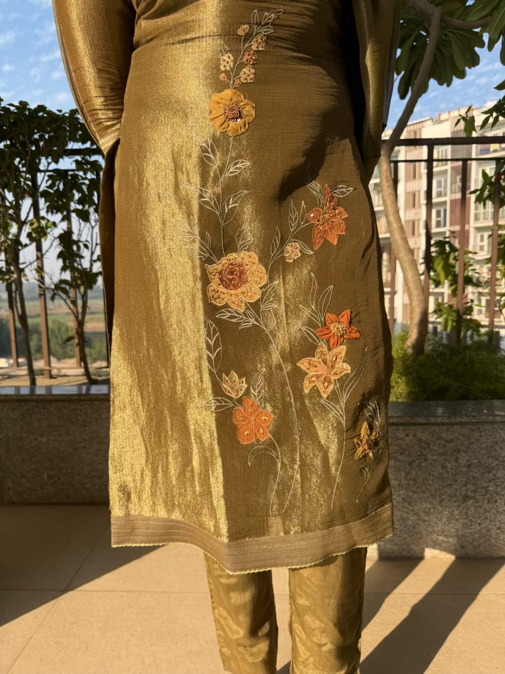 Mustard Crepe Printed & Aari-Embroidered Unstitched Suit Set