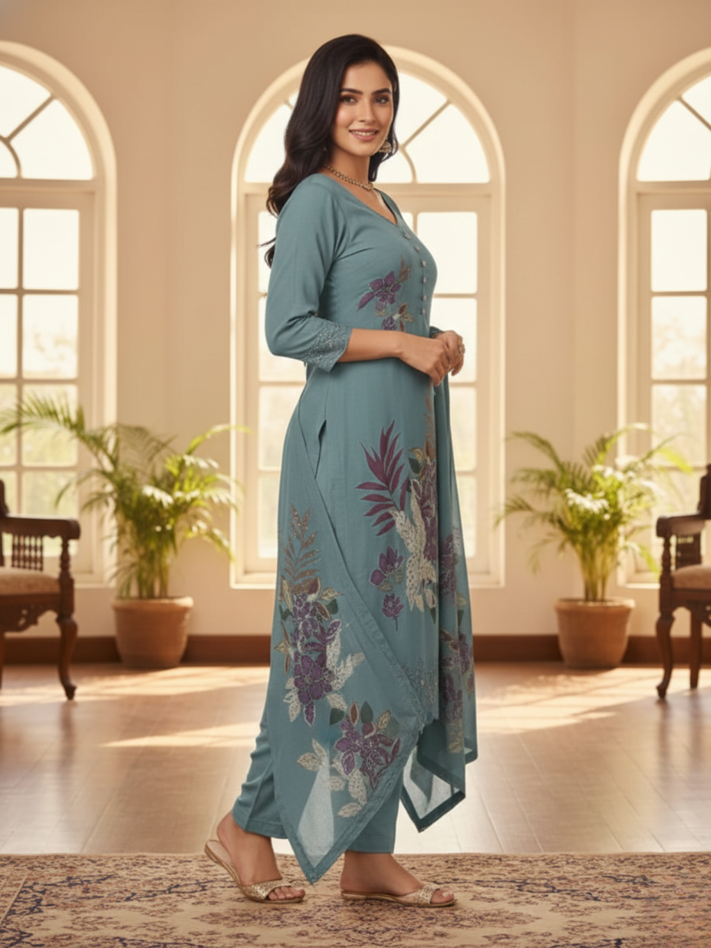 Teal Crepe Printed & Aari-Embroidered Unstitched Suit Set
