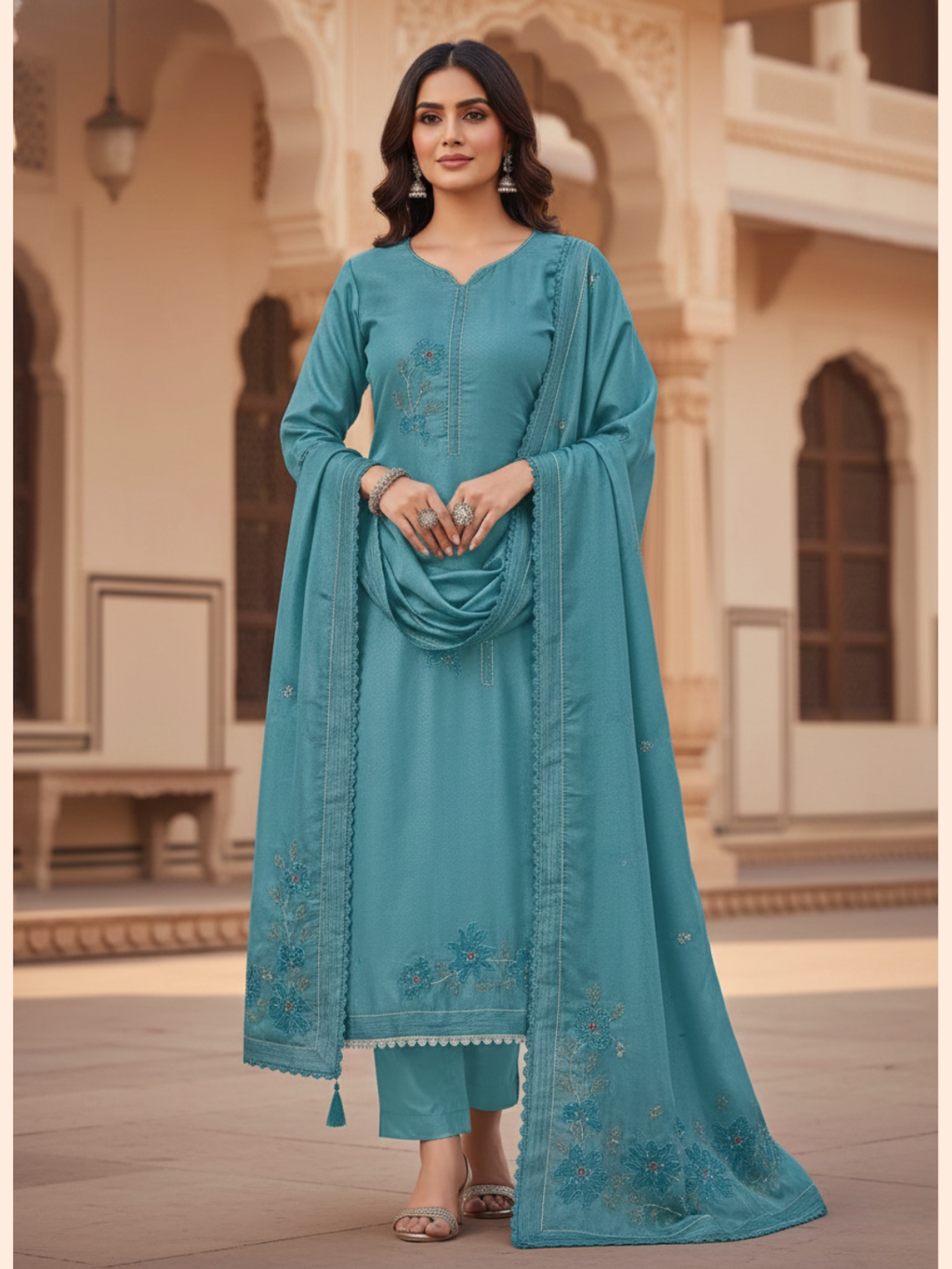 Turquoise Silk Unstitched Suit Set with Patch & Embroiderd