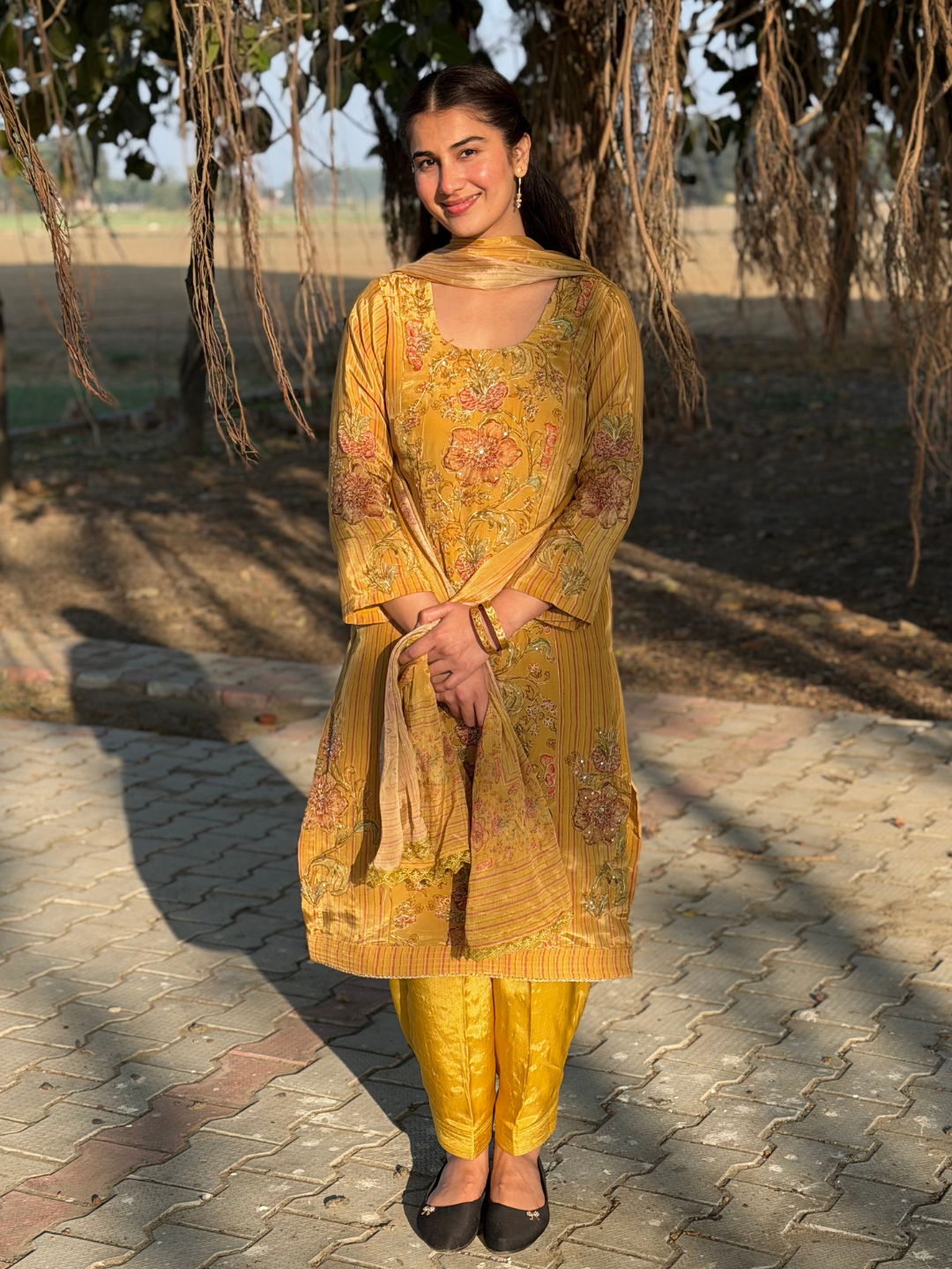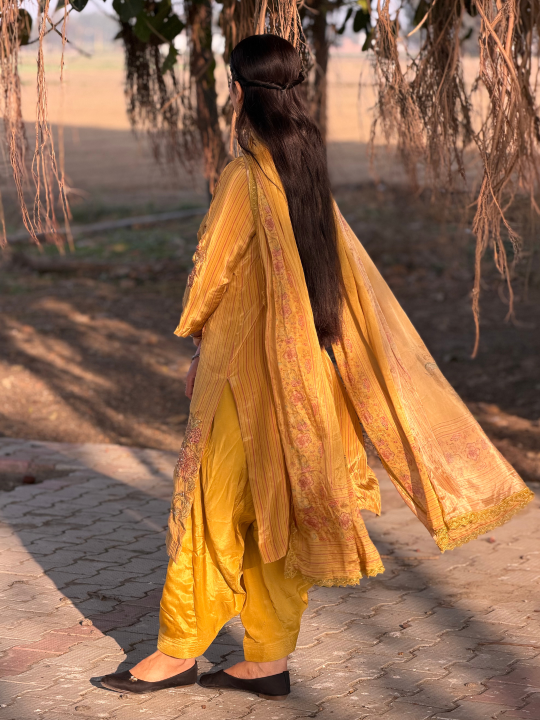 Dupatta: Matching printed crepe dupatta finished with a delicate golden lace on border.