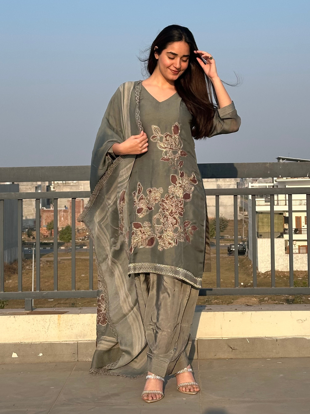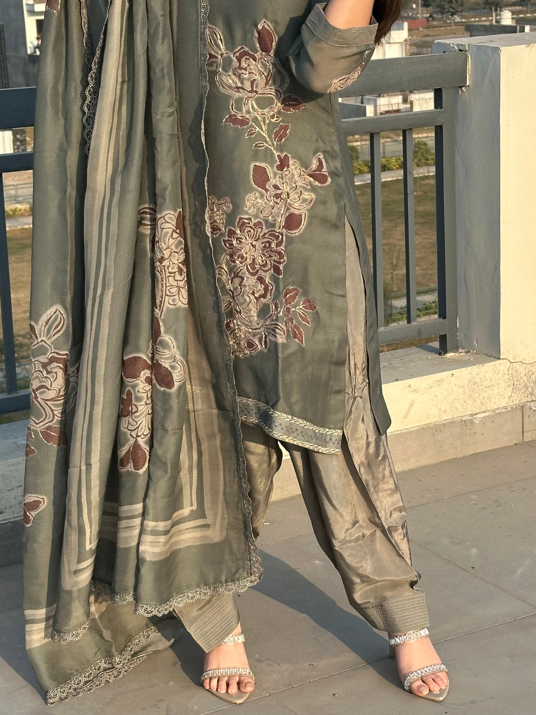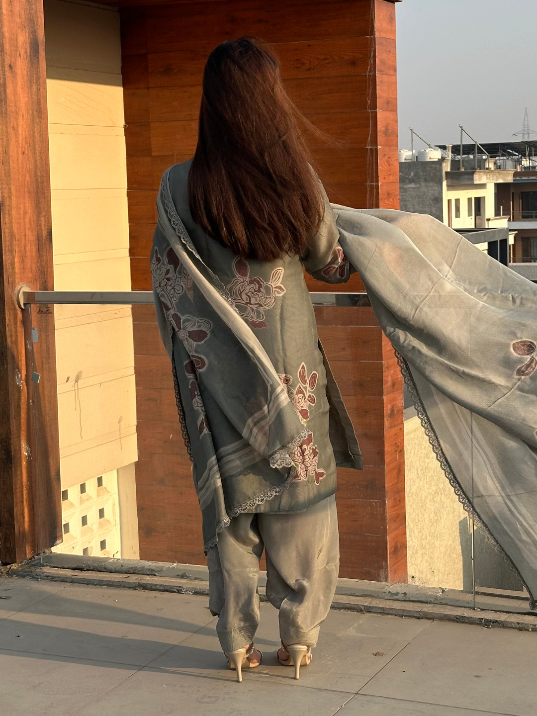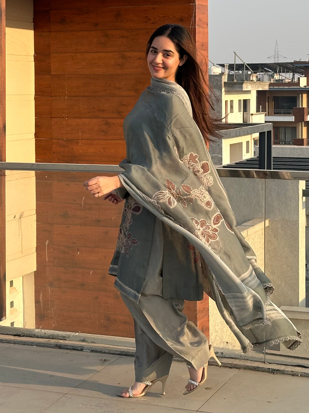 Shirt: Premium cashmere organza shirt adorned with digital print, delicate handwork, with fine zari embroidery. The digitally printed back adds a luxurious finish. (Length: 2.50 meters)