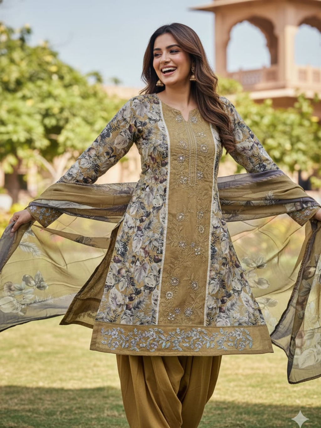 Mocha Printed Burberry With Embroidered Bottom Unstitched Suit Set