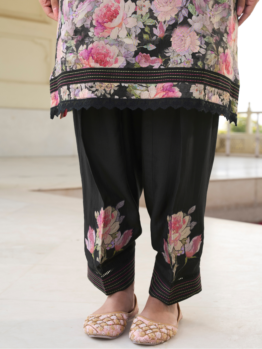Bottom: The muslin bottom is gracefully accented with delicate patch embroidery.