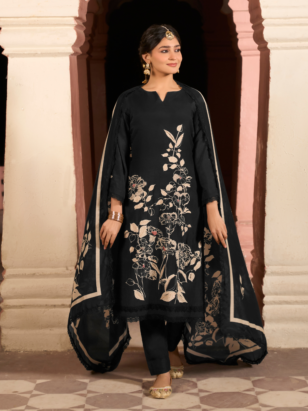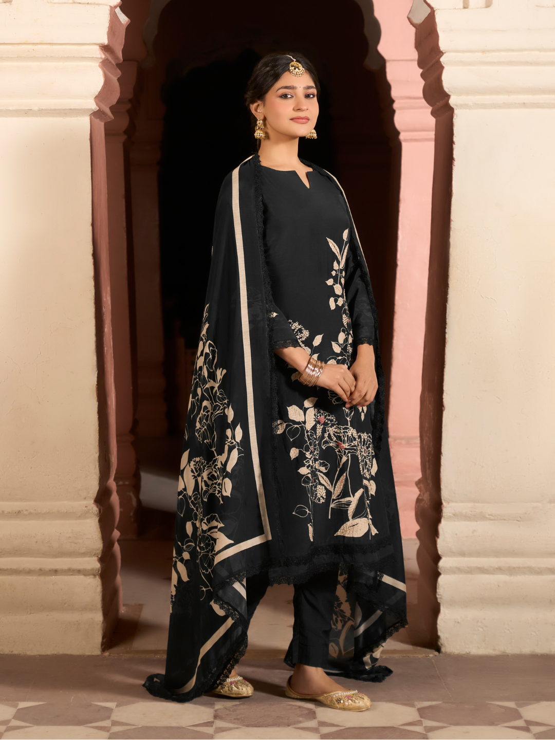 Bottom: Coordinated plain muslin fabric offering a soft, graceful drape and comfortable wear. (Length: 2.75 meters)