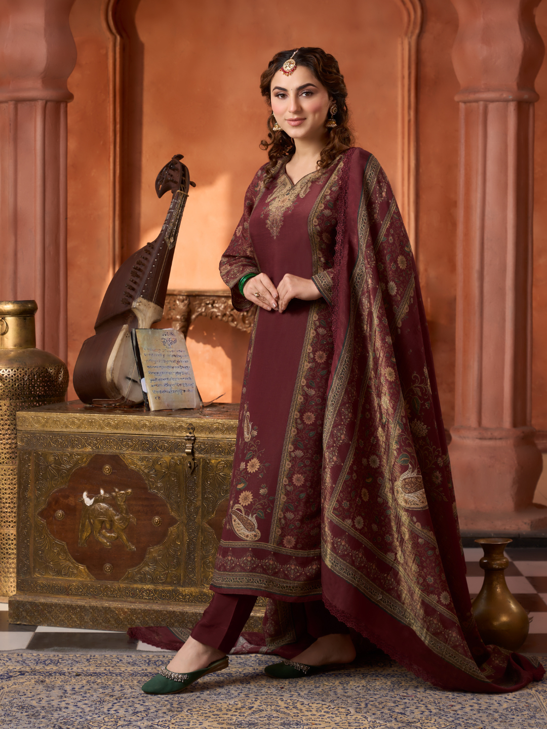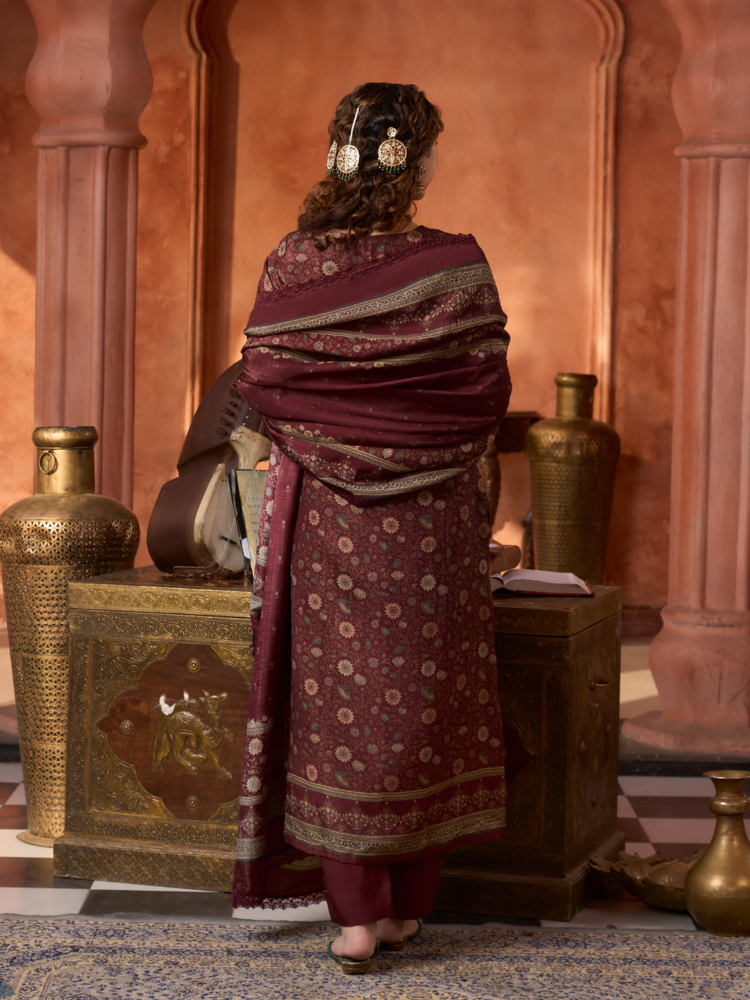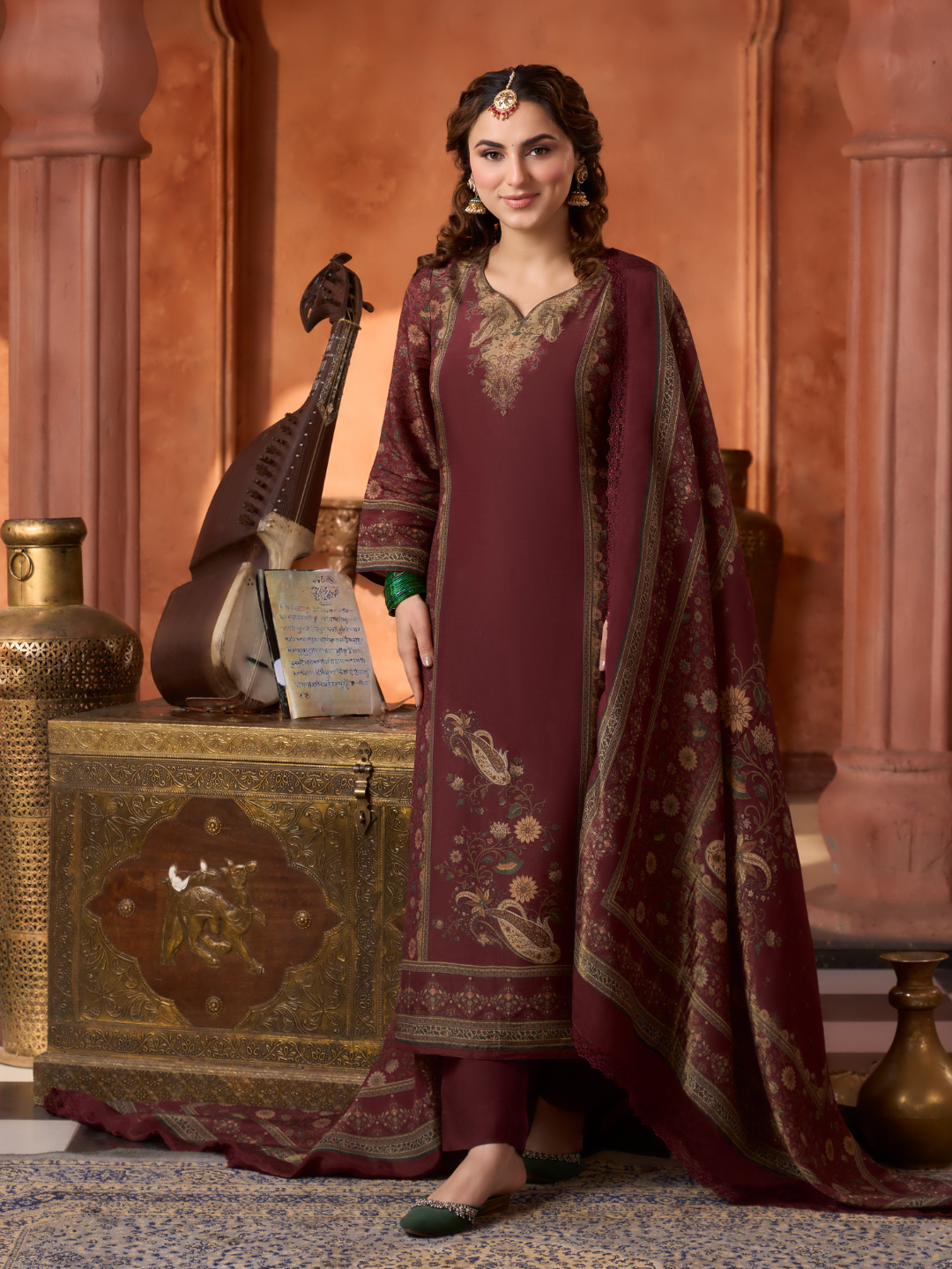 Dupatta: Matching gucci silk Kashmiri-style printed dupatta with all side lace. (Length: 2.60 meters)
