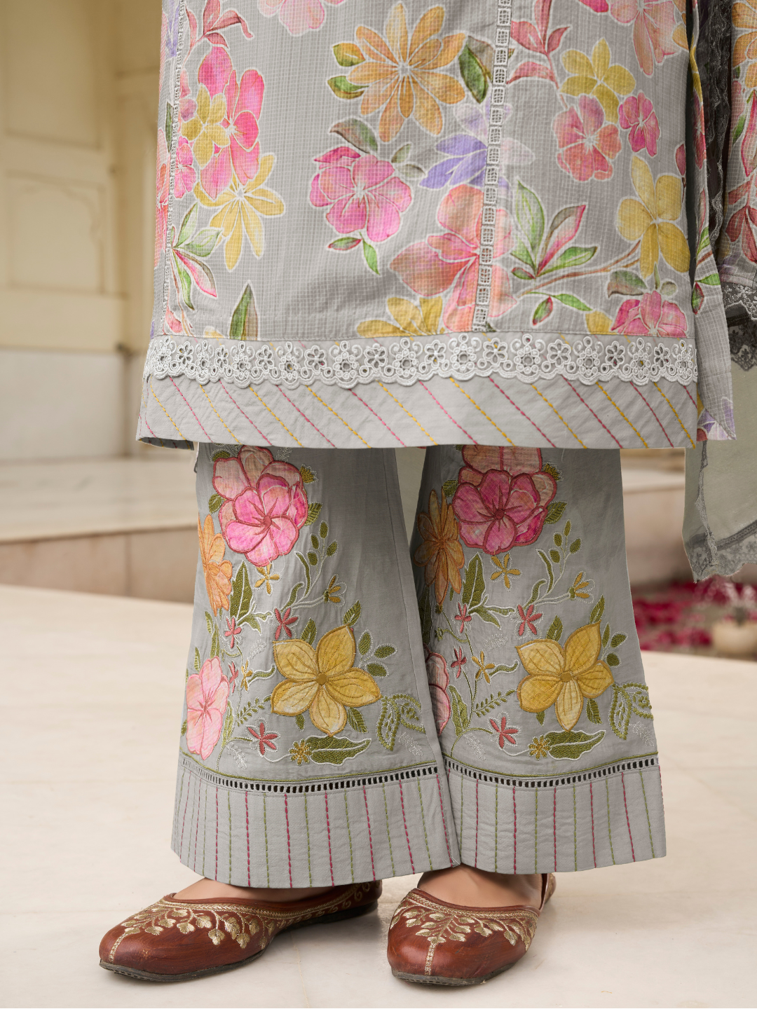 Bottom: The muslin bottom is gracefully accented with delicate patch embroidery.