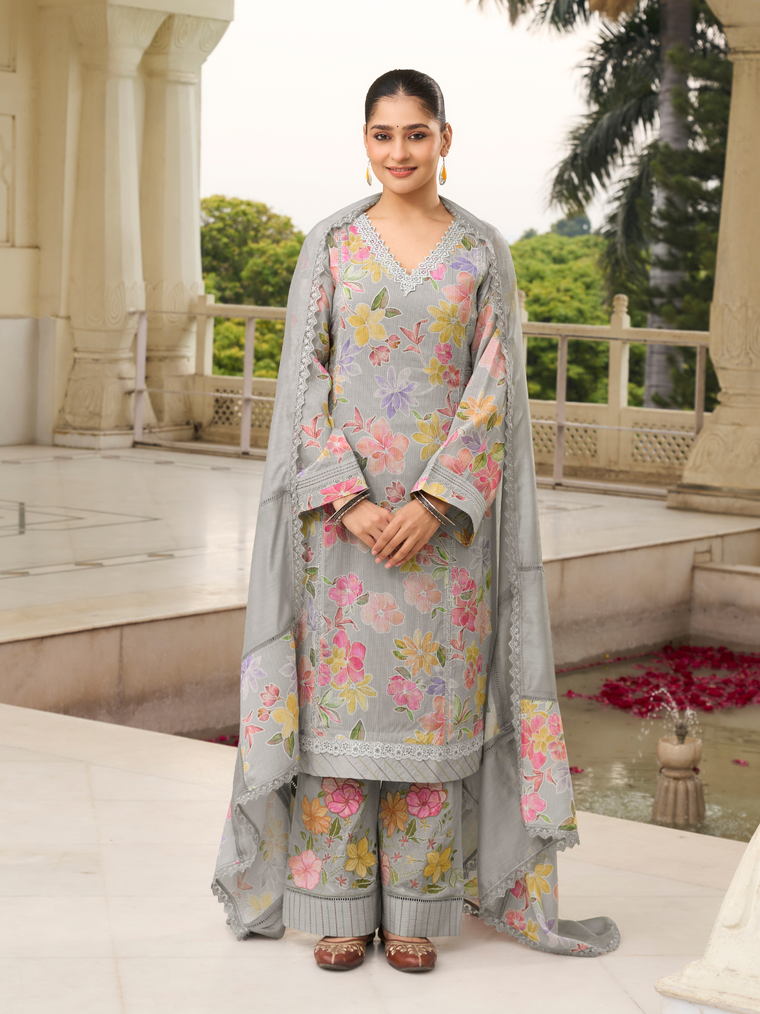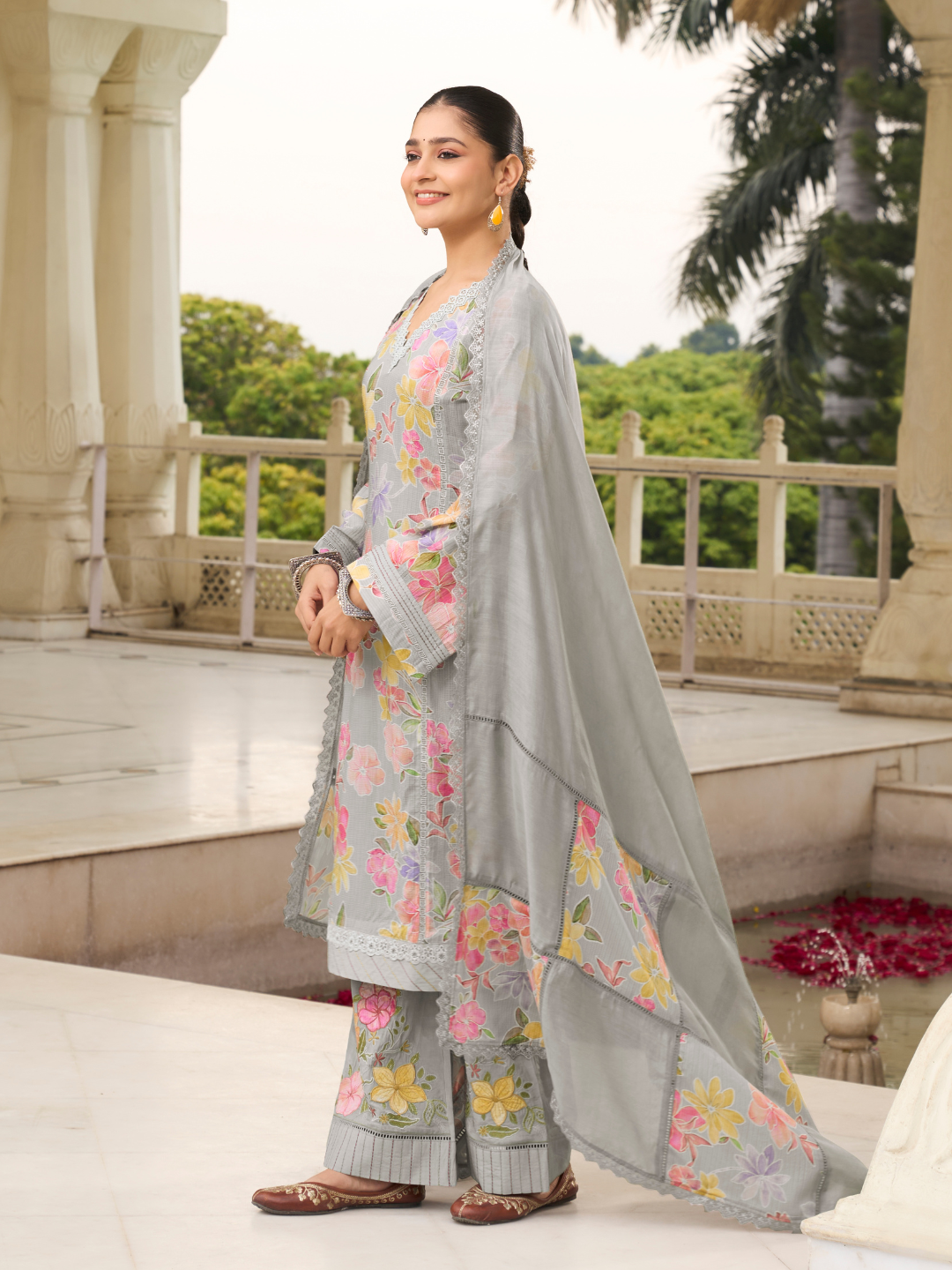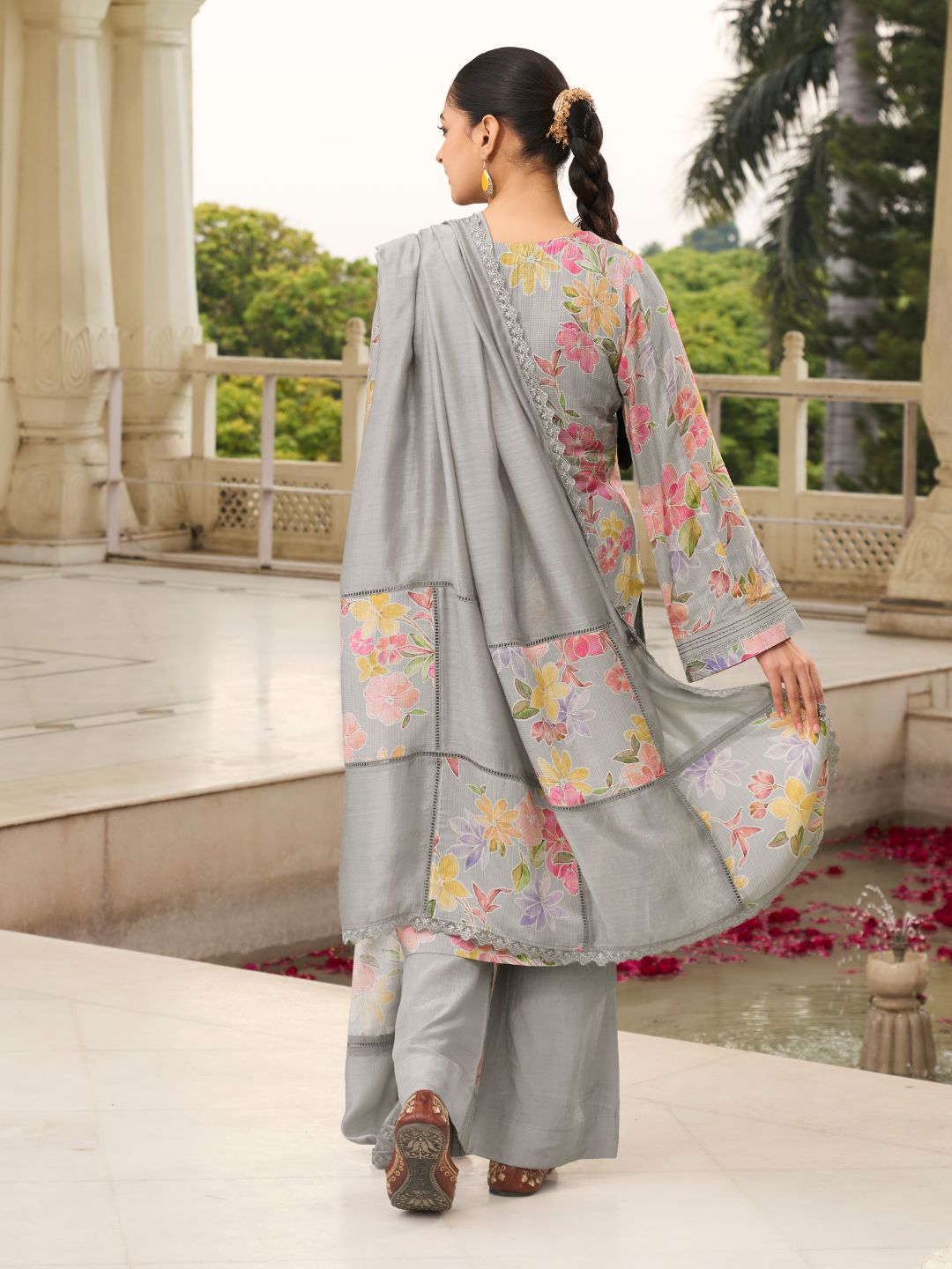 Dupatta: Muslin designer dupatta, finished with elegant lace work. (Length: 2.35 meters)