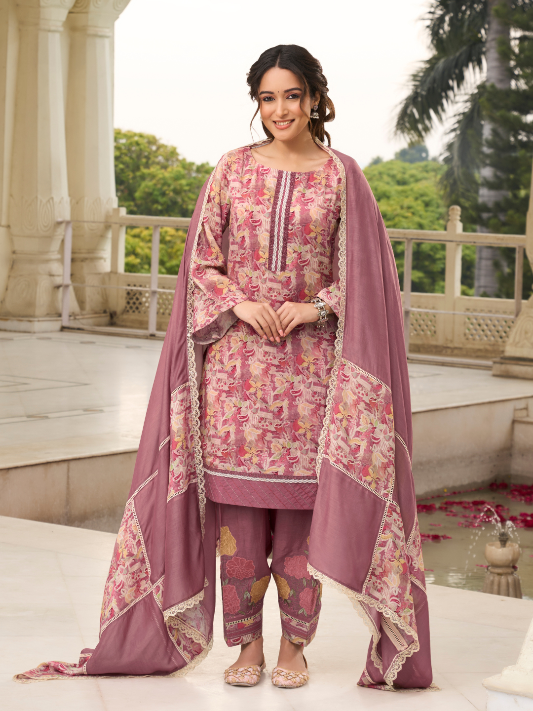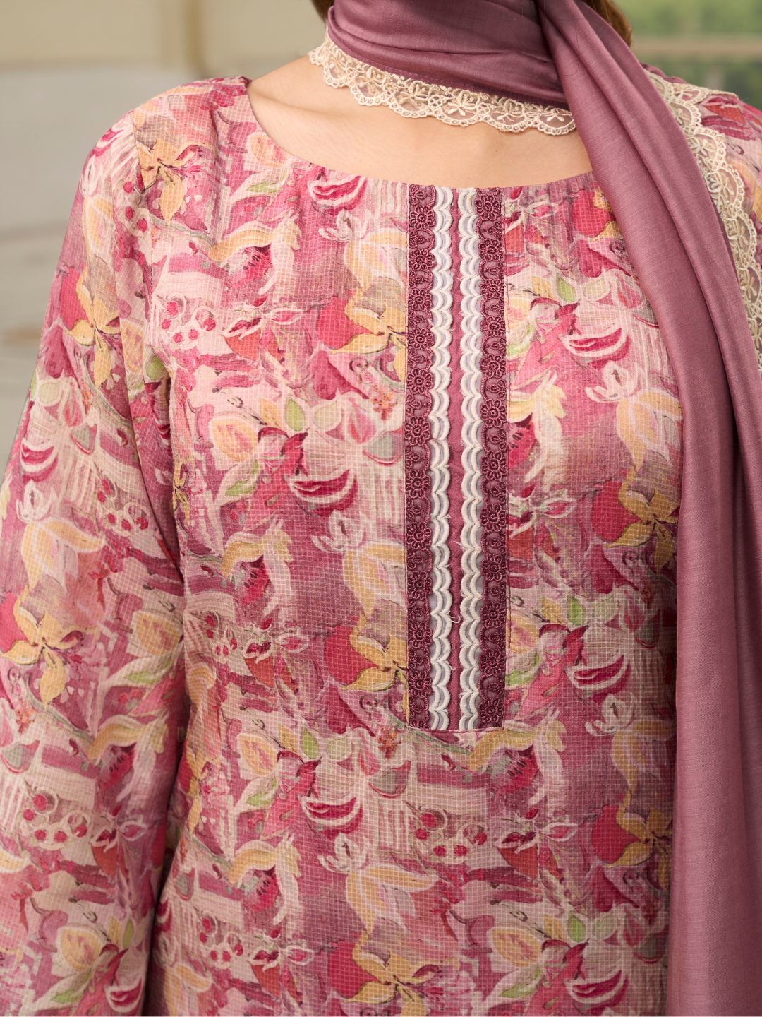 Dupatta: Muslin designer dupatta, finished with elegant lace work. (Length: 2.35 meters)
