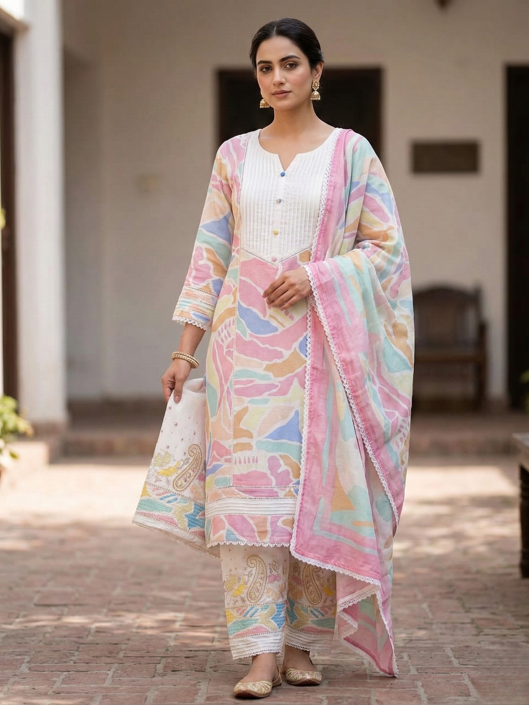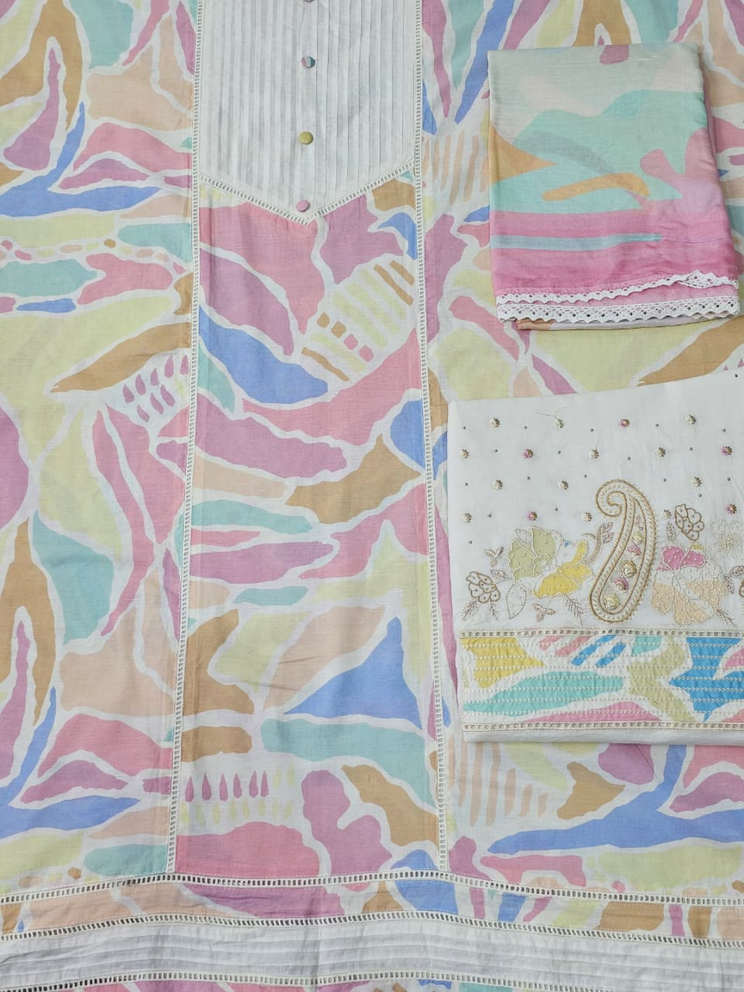 Dupatta: Muslin printed dupatta finished with delicate designer lace work. (Length: 2.40 meters)