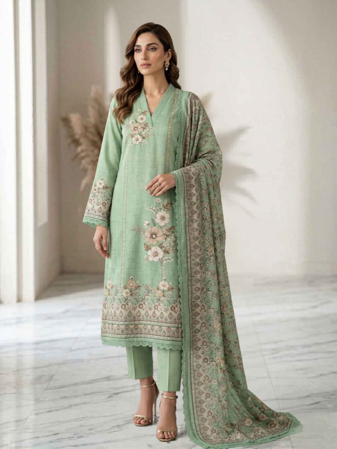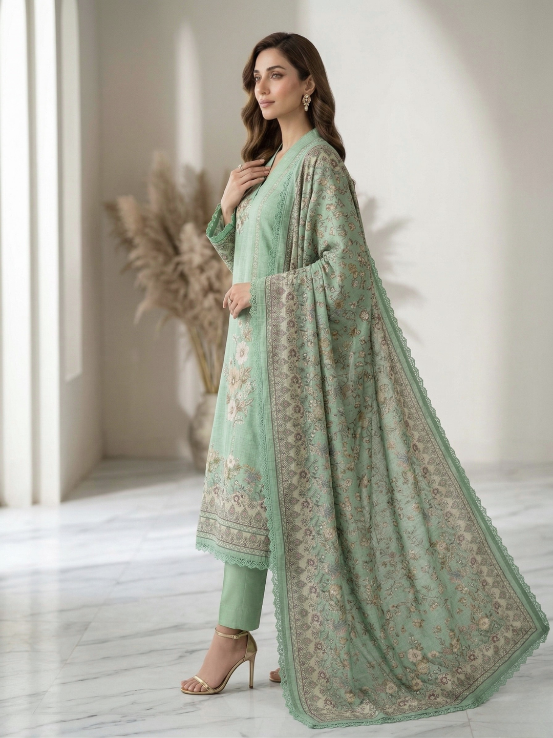 Dupatta: Muslin printed dupatta finished with delicate designer lace work. (Length: 2.40 meters)