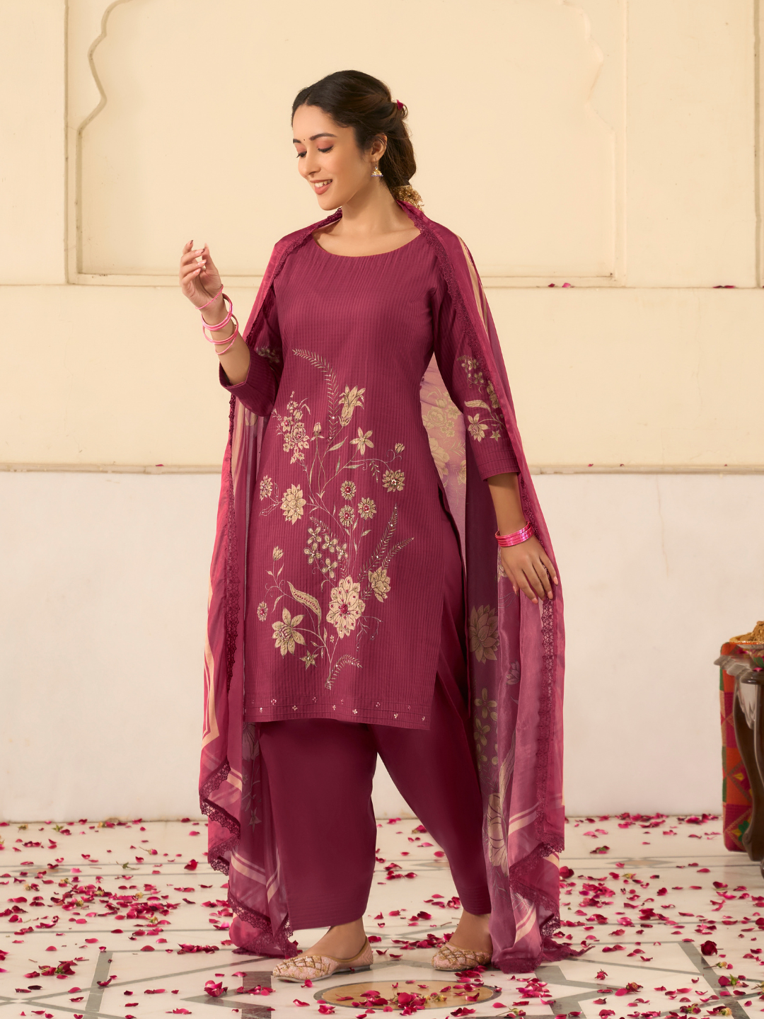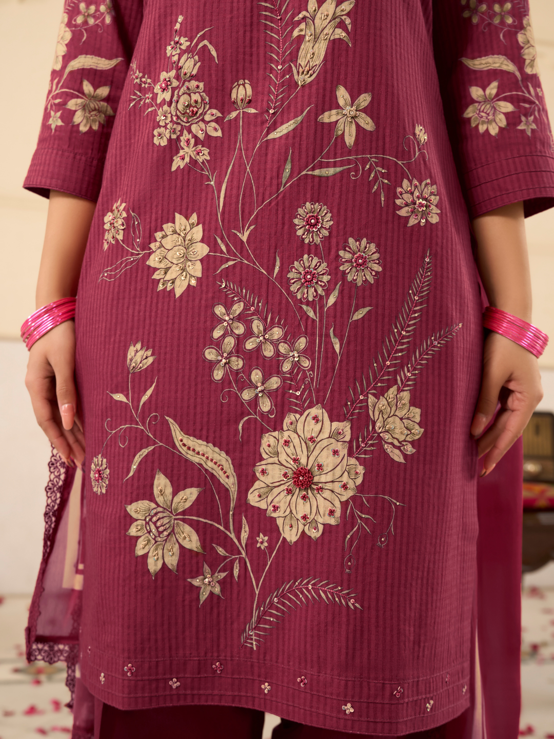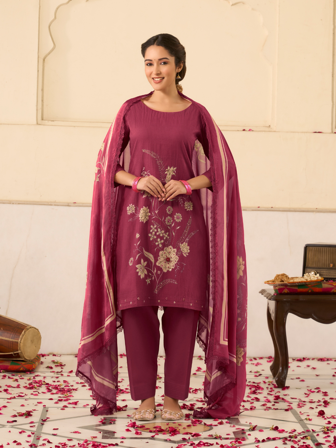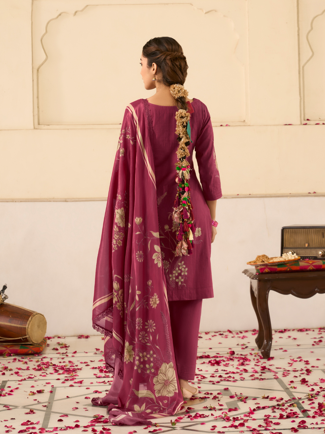 Dark Fuchsia Printed Check Cotton Embroidered Unstitched Suit Set