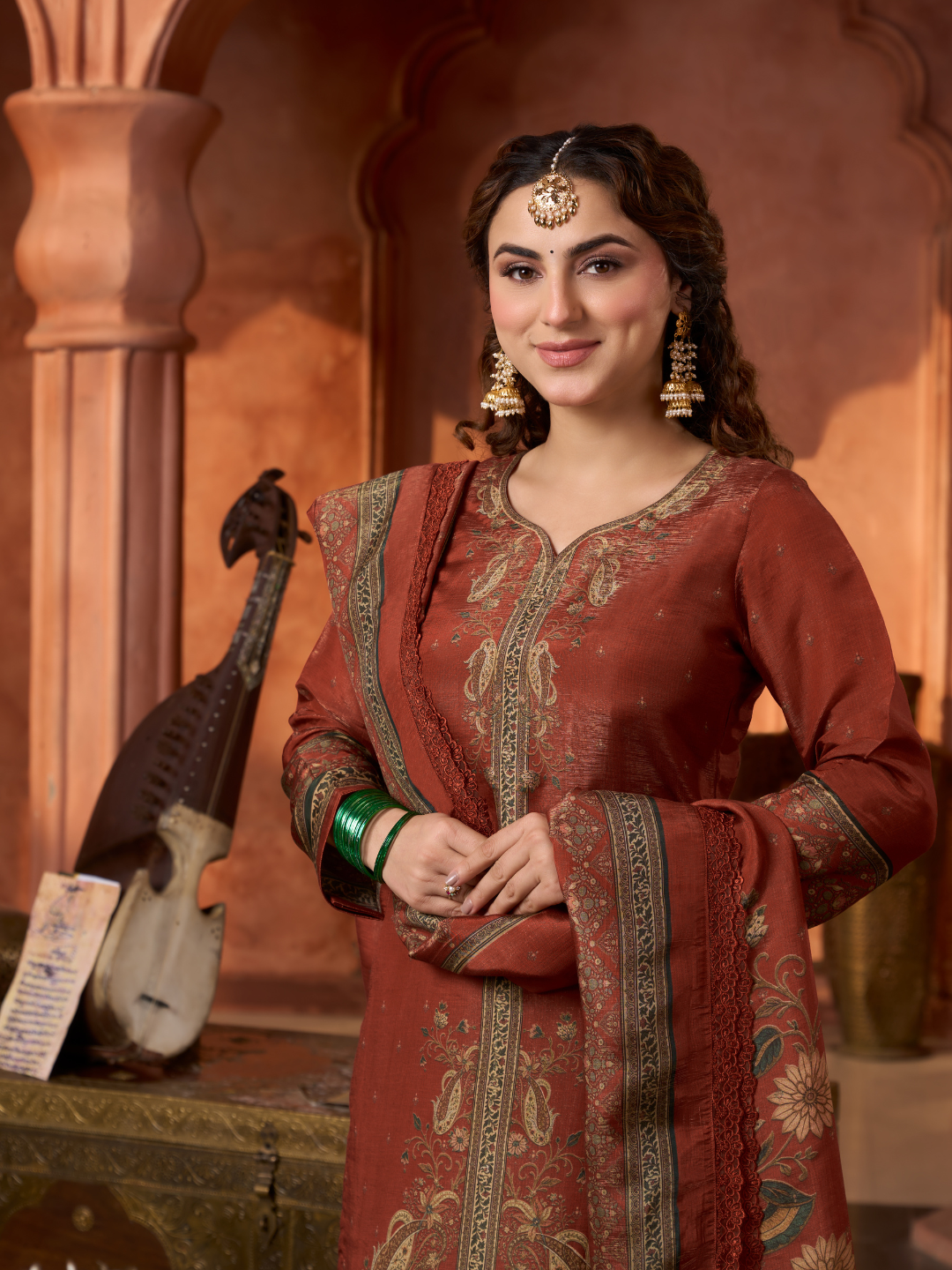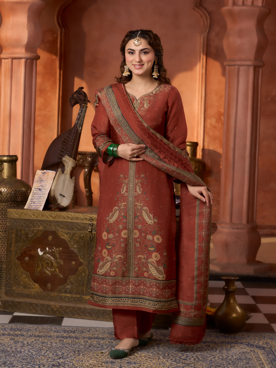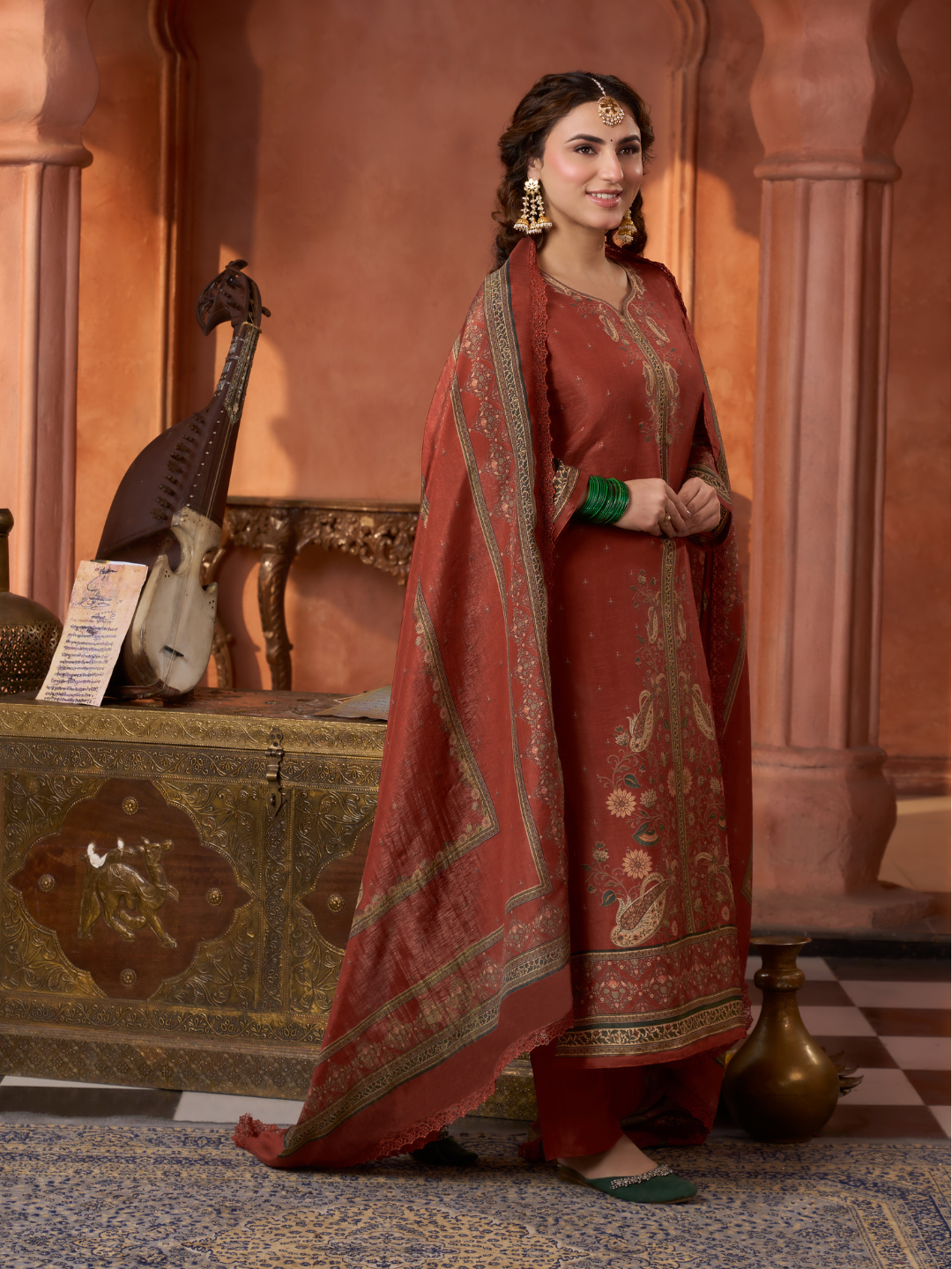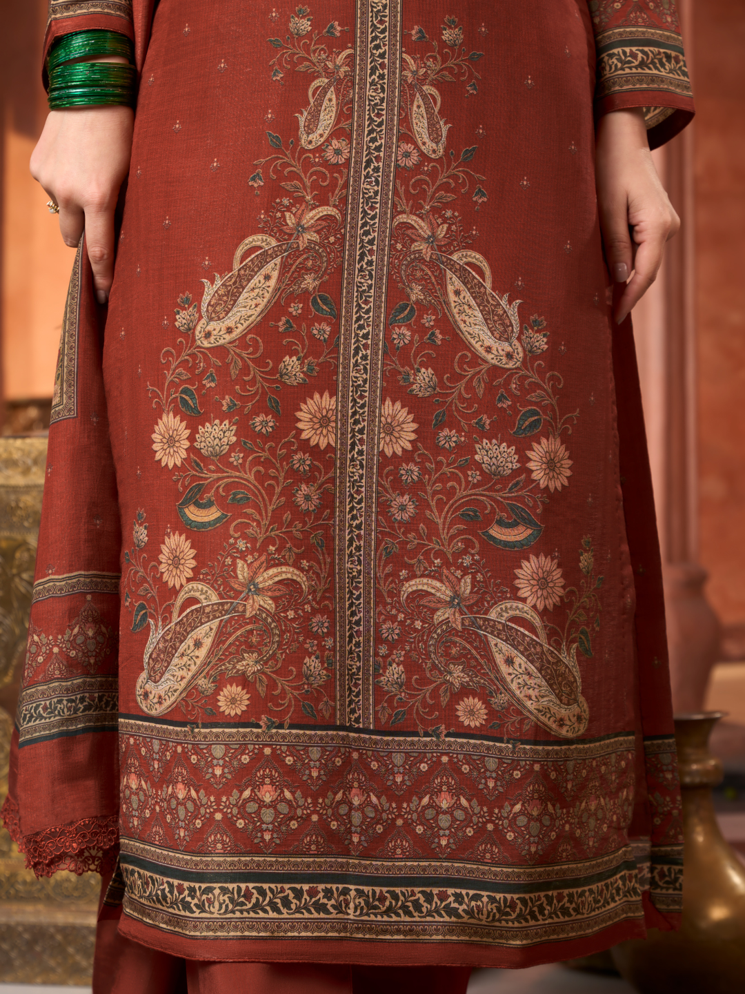 Dupatta: Matching gucci silk Kashmiri-style printed dupatta with all side lace. (Length: 2.60 meters)