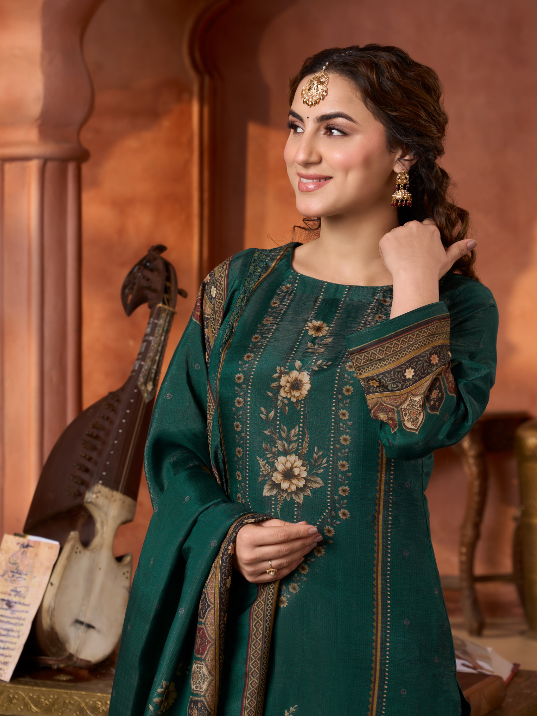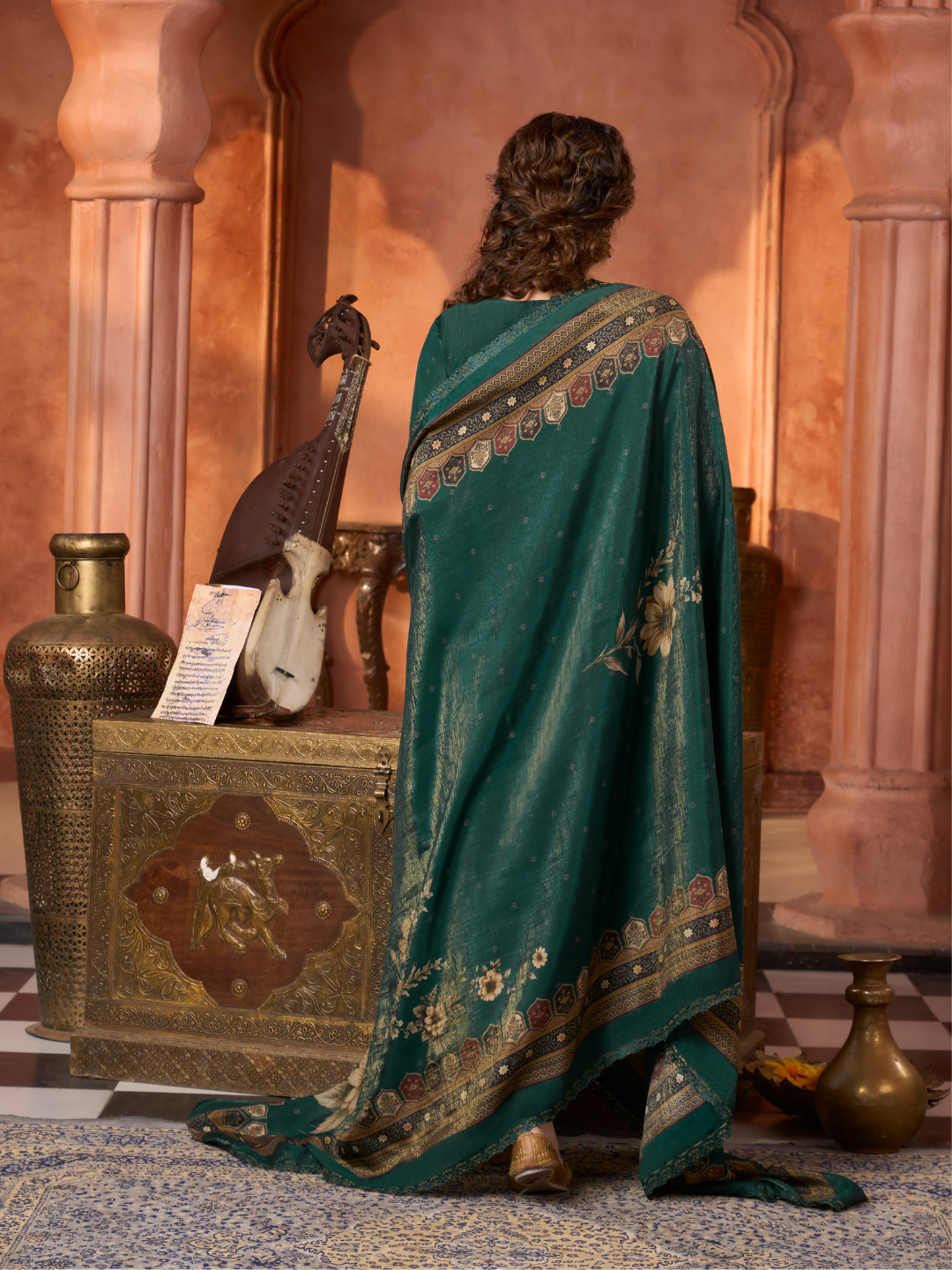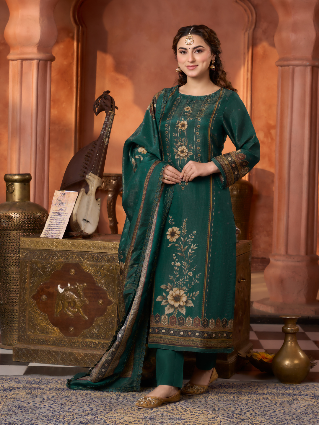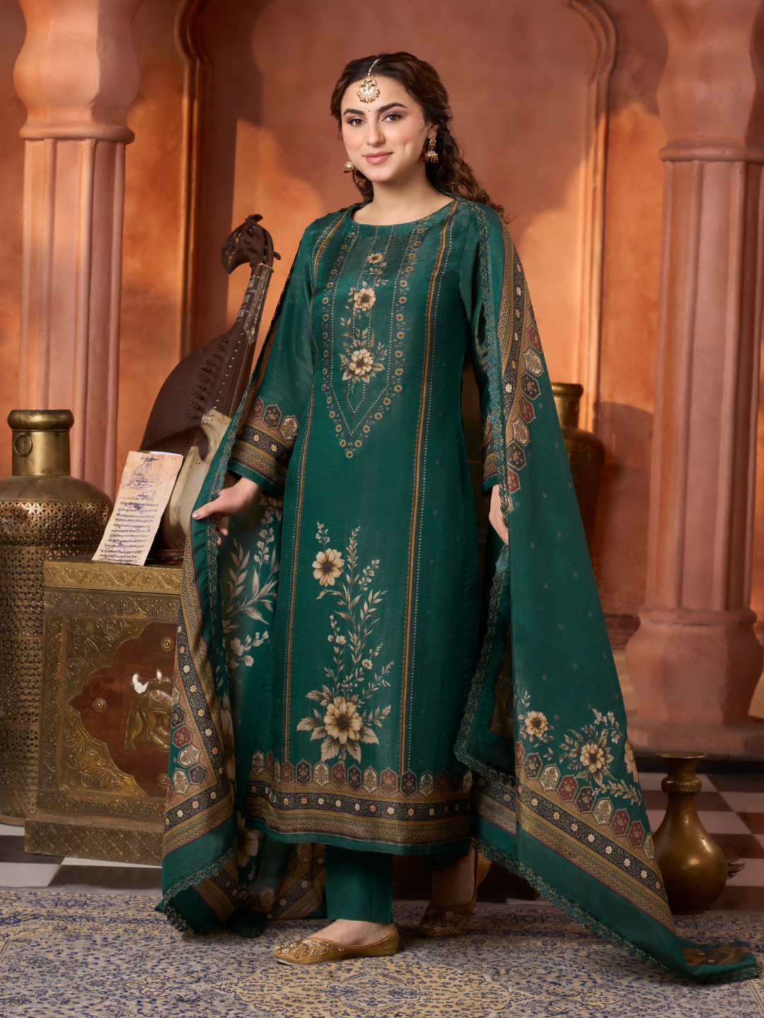 Dupatta: Matching gucci silk Kashmiri-style printed dupatta with all side lace. (Length: 2.60 meters)