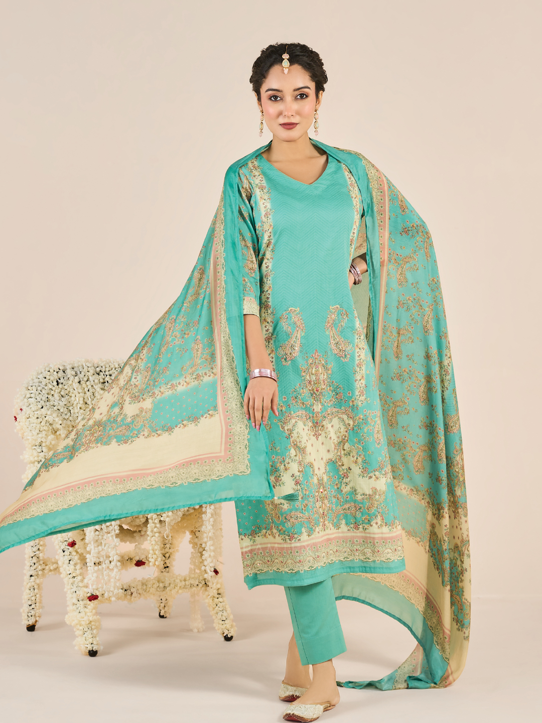 Turquoise Printed Cotton Embroidered Unstitched Suit Set