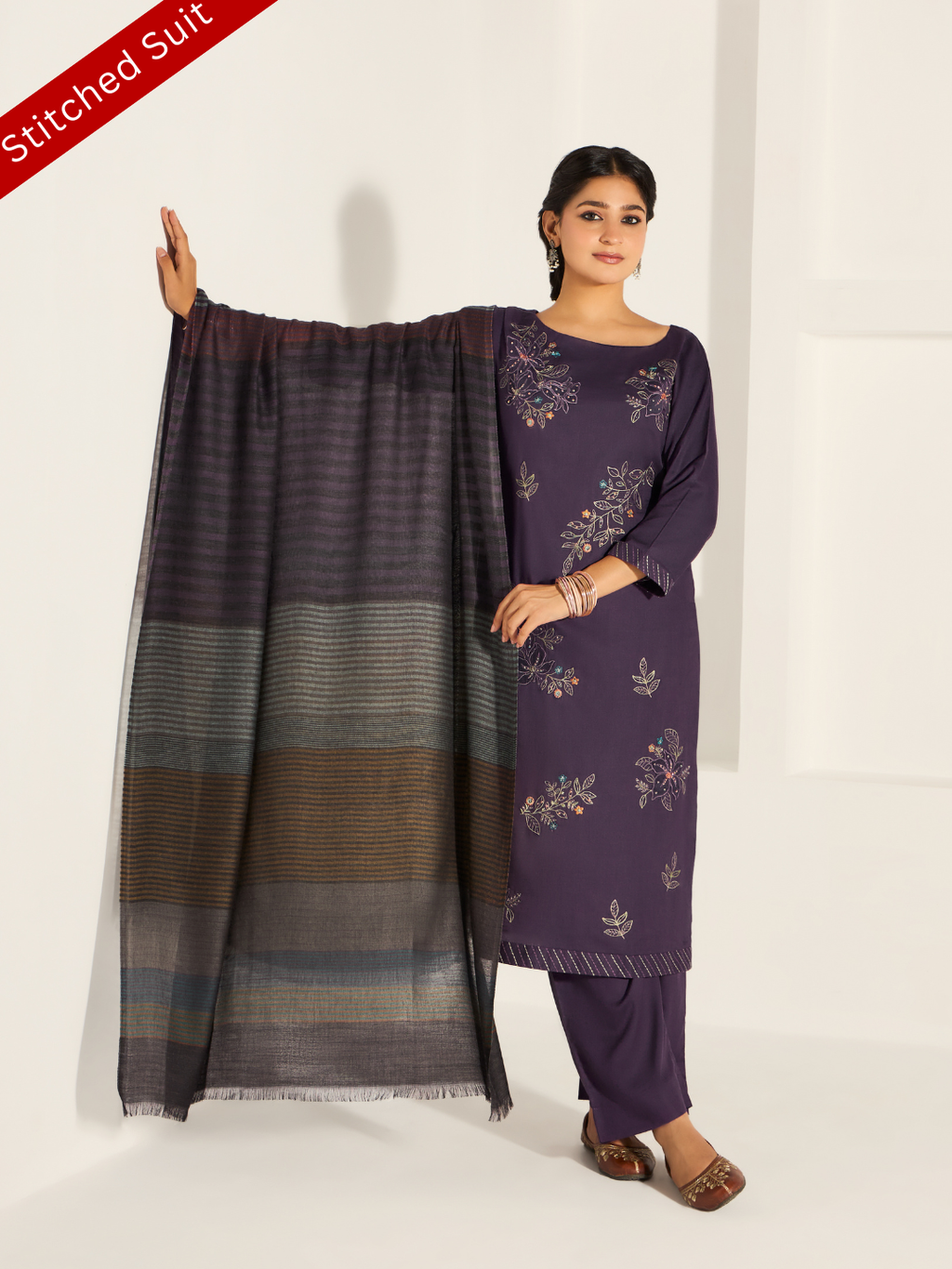 Deep Grey Pashmina Embroidered Stitched Suit Set with Shawl