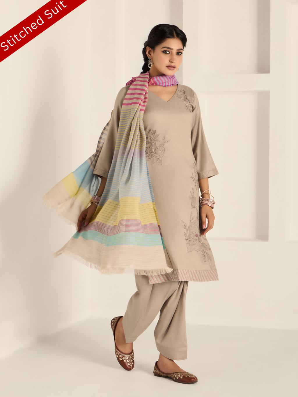 Ashen Beige Pure Wool Hand-Embroidered Stitched Suit Set