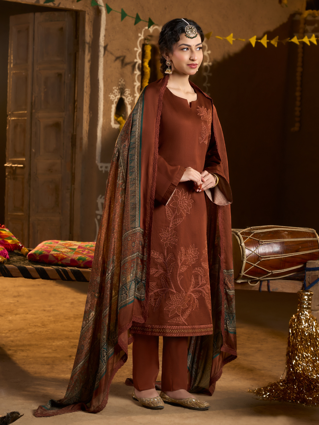 Rust Cotton Patch Embroidered Stitched Suit Set