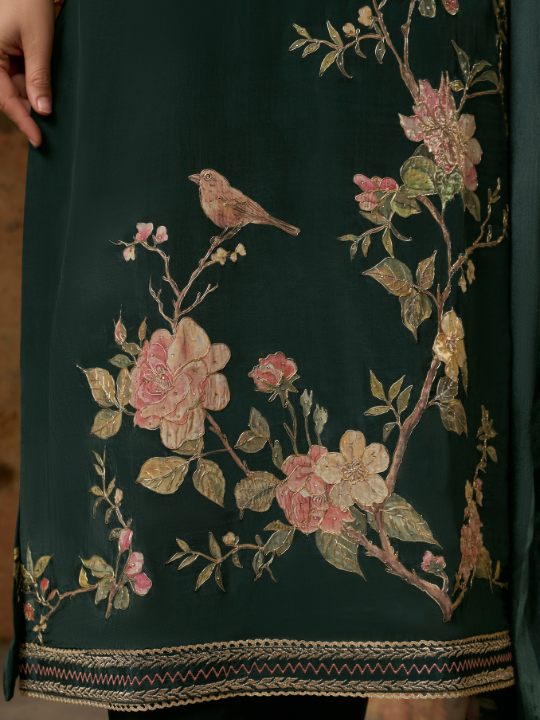 Shirt: Beautifully printed crepe shirt highlighted with delicate aari embroidery along the borders and print on the back.