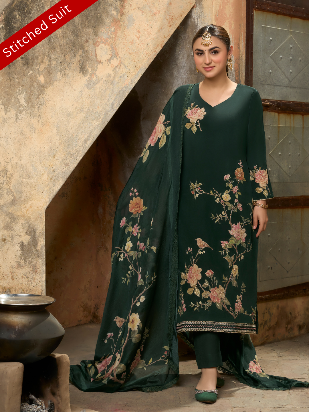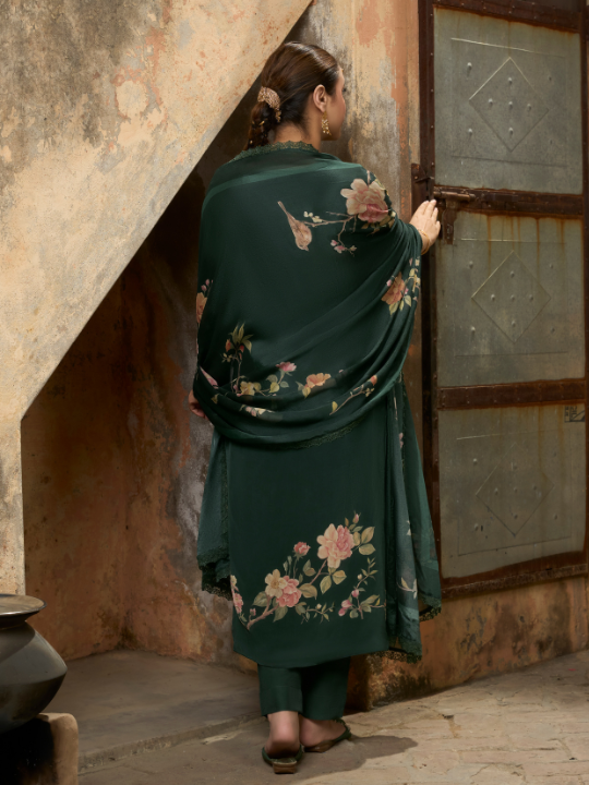 Dupatta: Matching printed Crepe dupatta finished with a delicate lace border.
