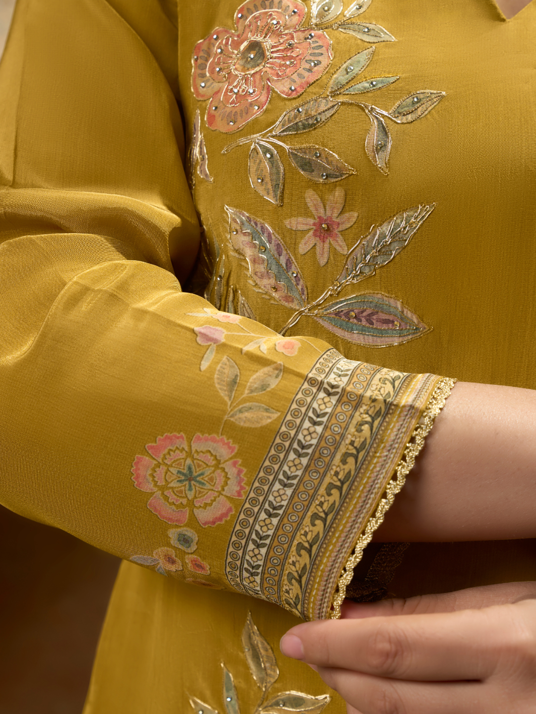Shirt: Beautifully printed crepe shirt highlighted with delicate aari embroidery along the borders and print on the back.