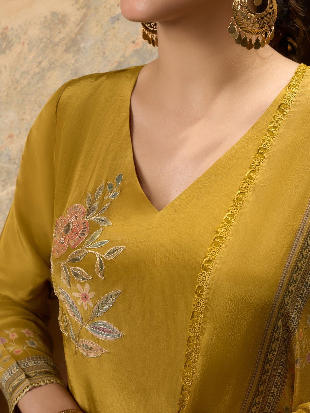 Dupatta: Matching printed Crepe dupatta finished with a delicate lace border.