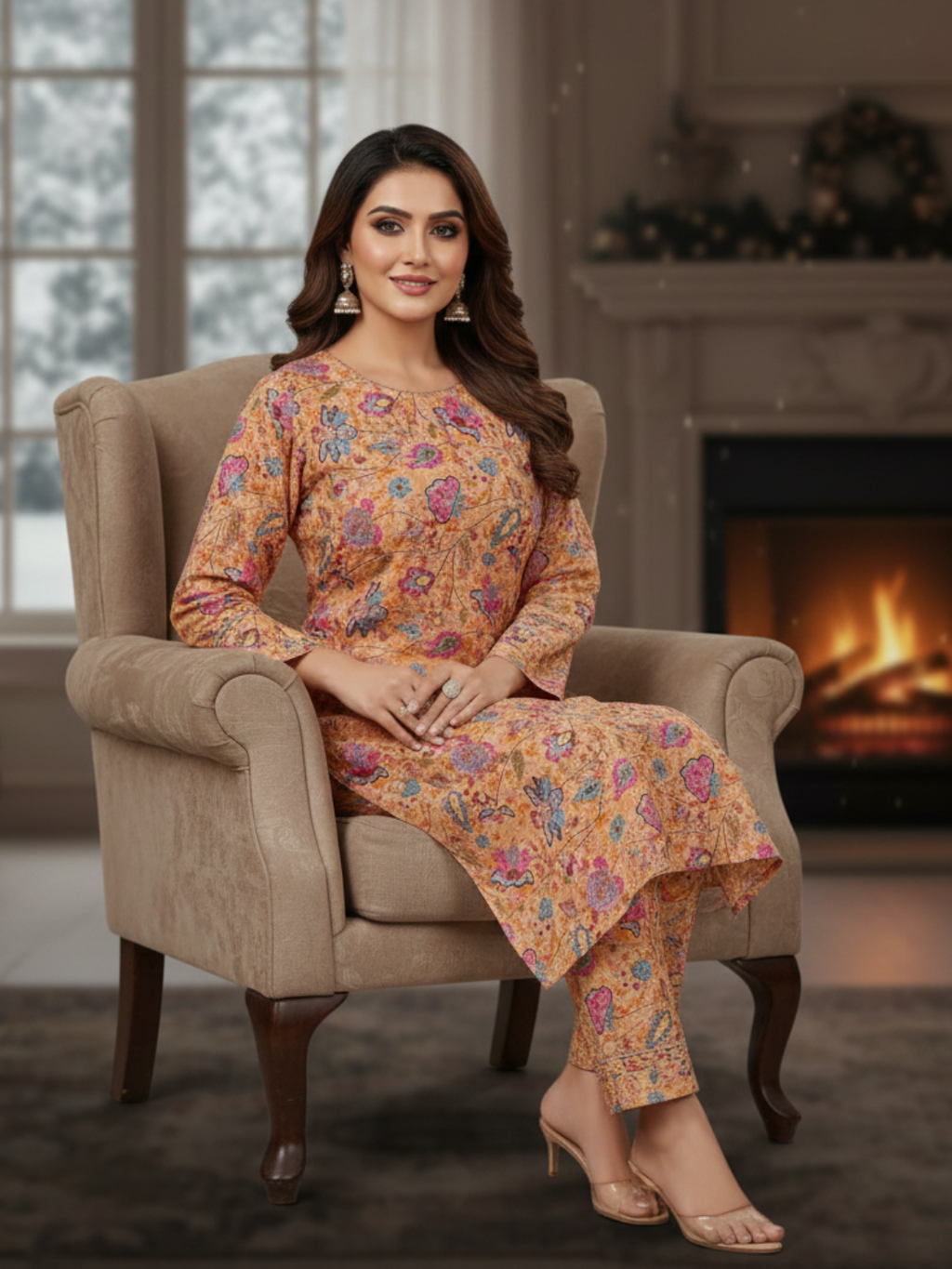 Shirt: Glace cotton shirt with digital print, delicate handwork, and multihead embroidery. Bottom: Matching printed glace cotton bottom designed for a coordinated and elegant look.