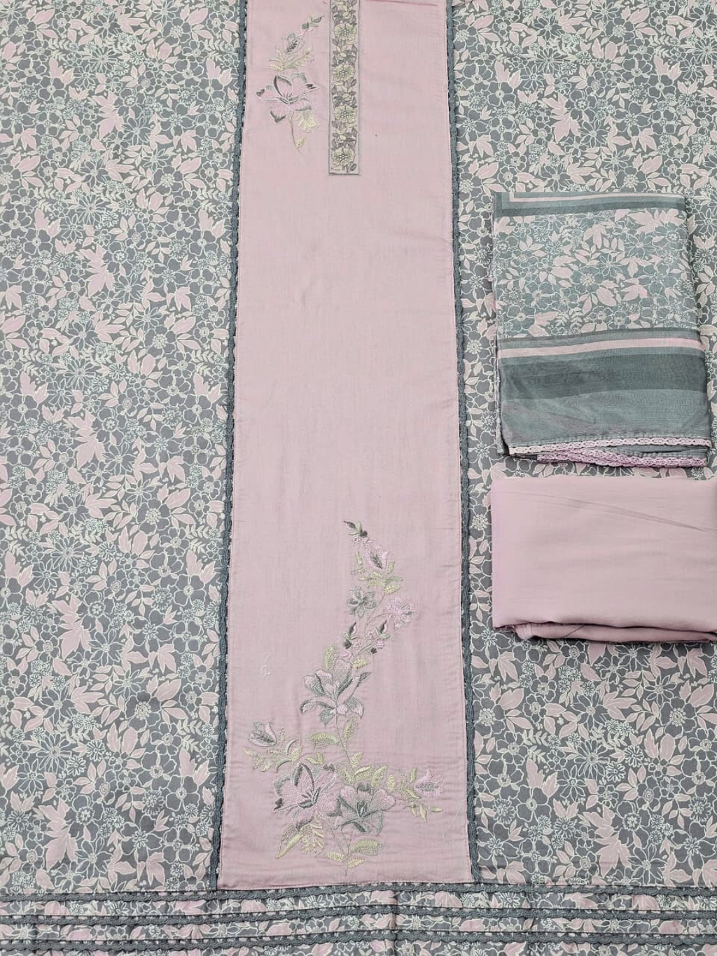 Pastel Pink & Grey Cotton Printed Embroidered Unstitched Suit Set