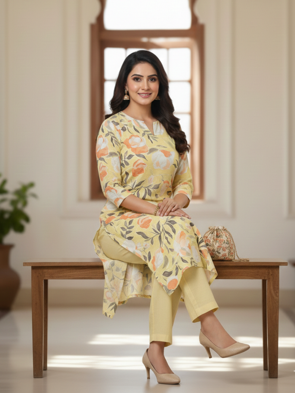 Lemon Yellow Cotton Matching Printed 2-Piece Suit Set