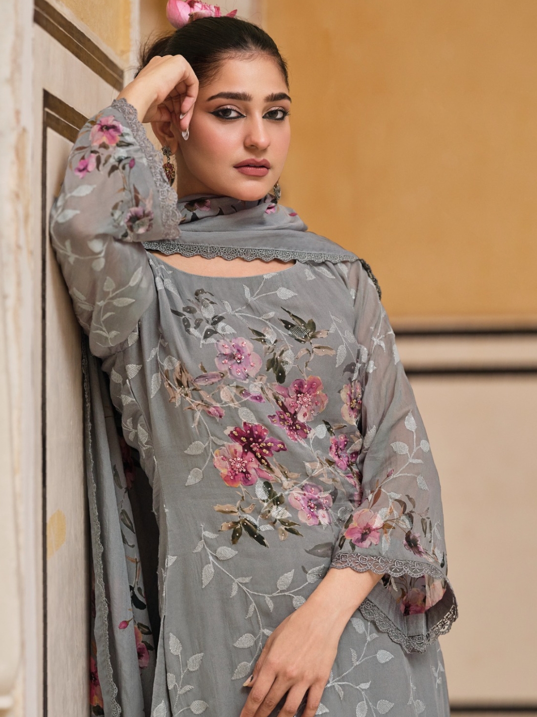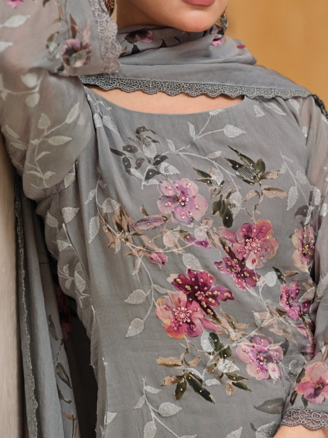Grey Sequins Embroidered Organza Party Wear Unstitched Suit Set
