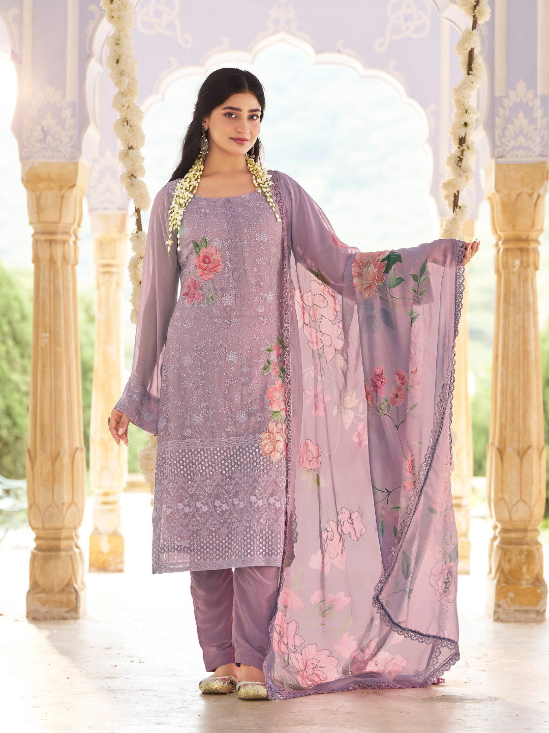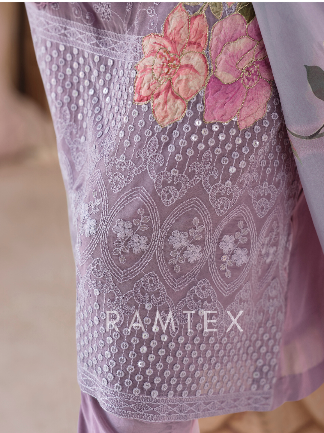 Lilac Georgette Chikankari Unstitched Suit Set with Patch & Zari Work