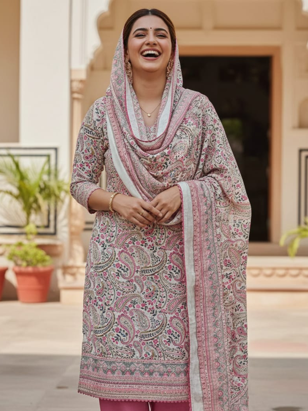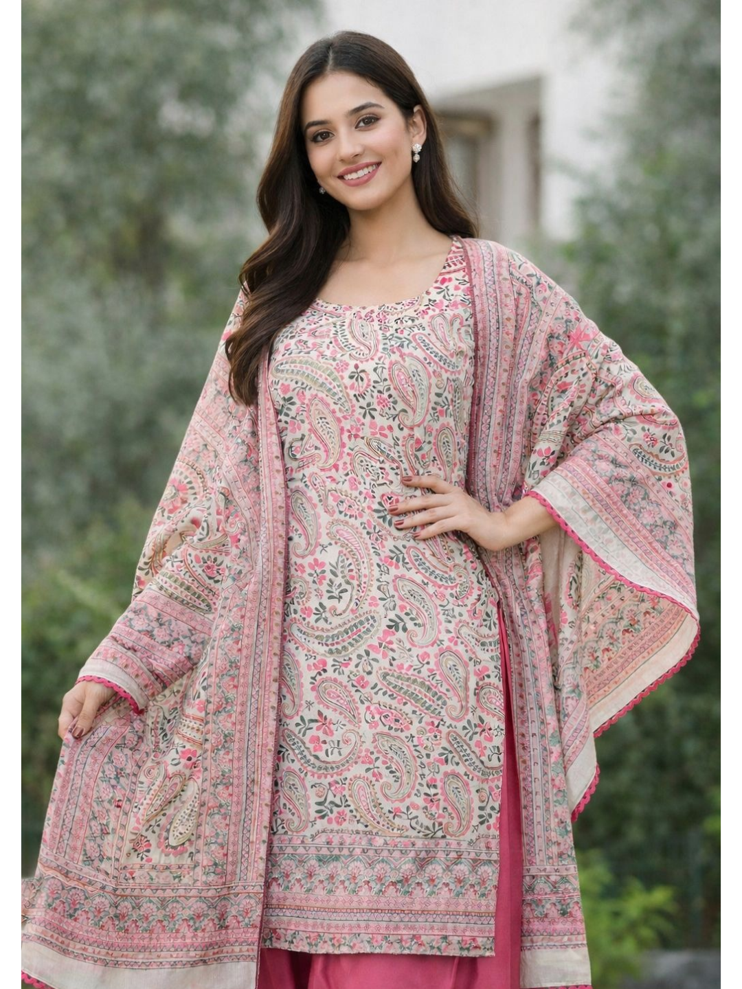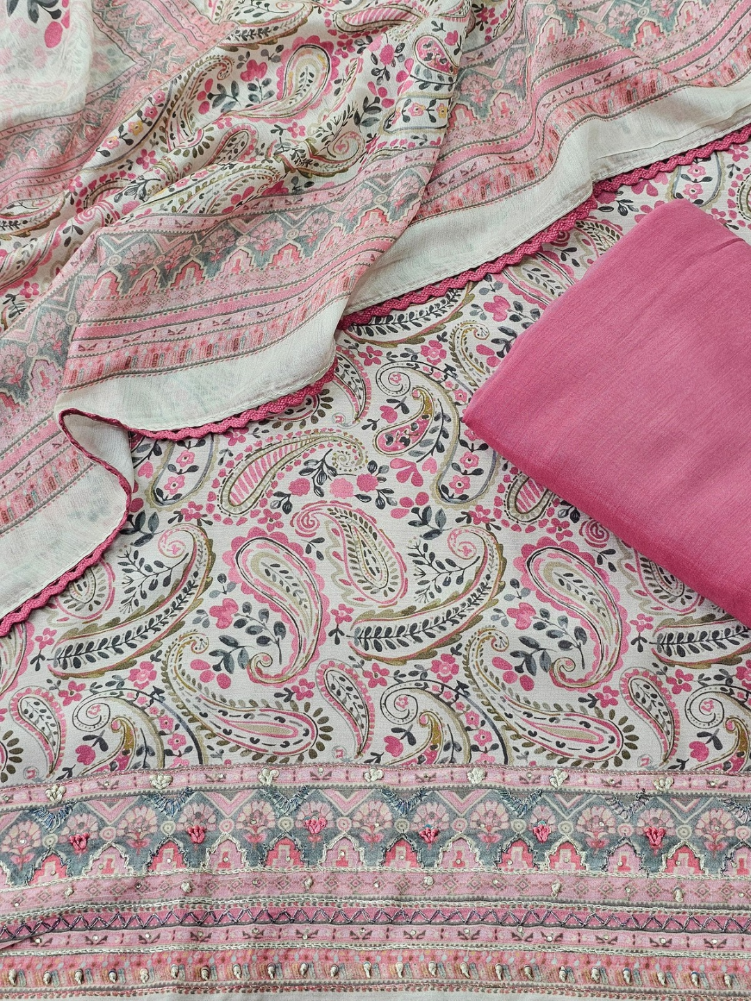 Pink Printed Muslin Embroidered Unstitched Suit Set