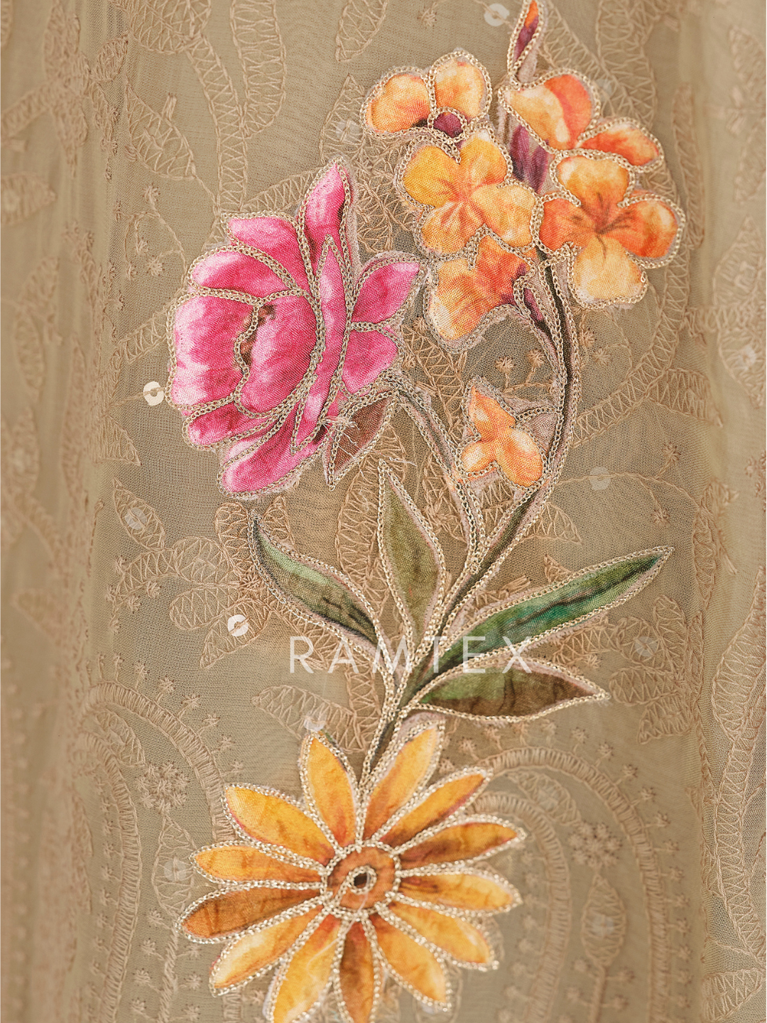 Shirt: Georgette with Chikan Kari front patchwork, zari detailing & handwork on neckline.