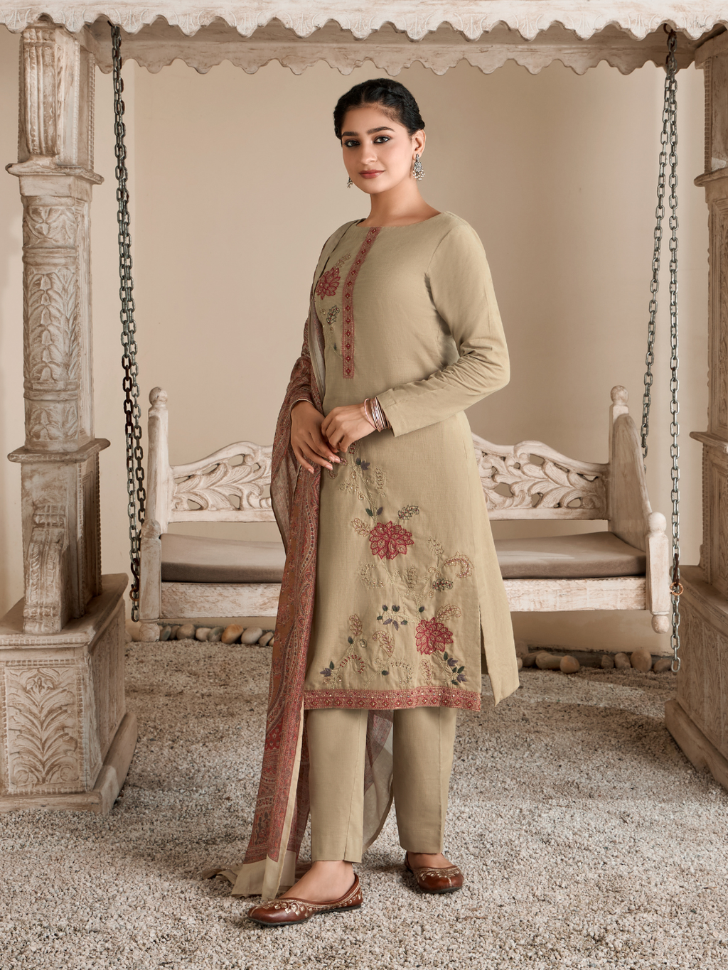 Beige Corduroy Printed Hand-Embroidered Unstitched Suit Set
