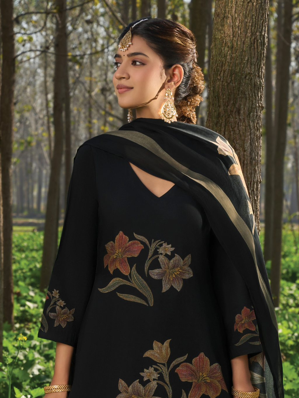 Black Organza Stitched Suit Multi-Thread Embroidery & Bottom Work