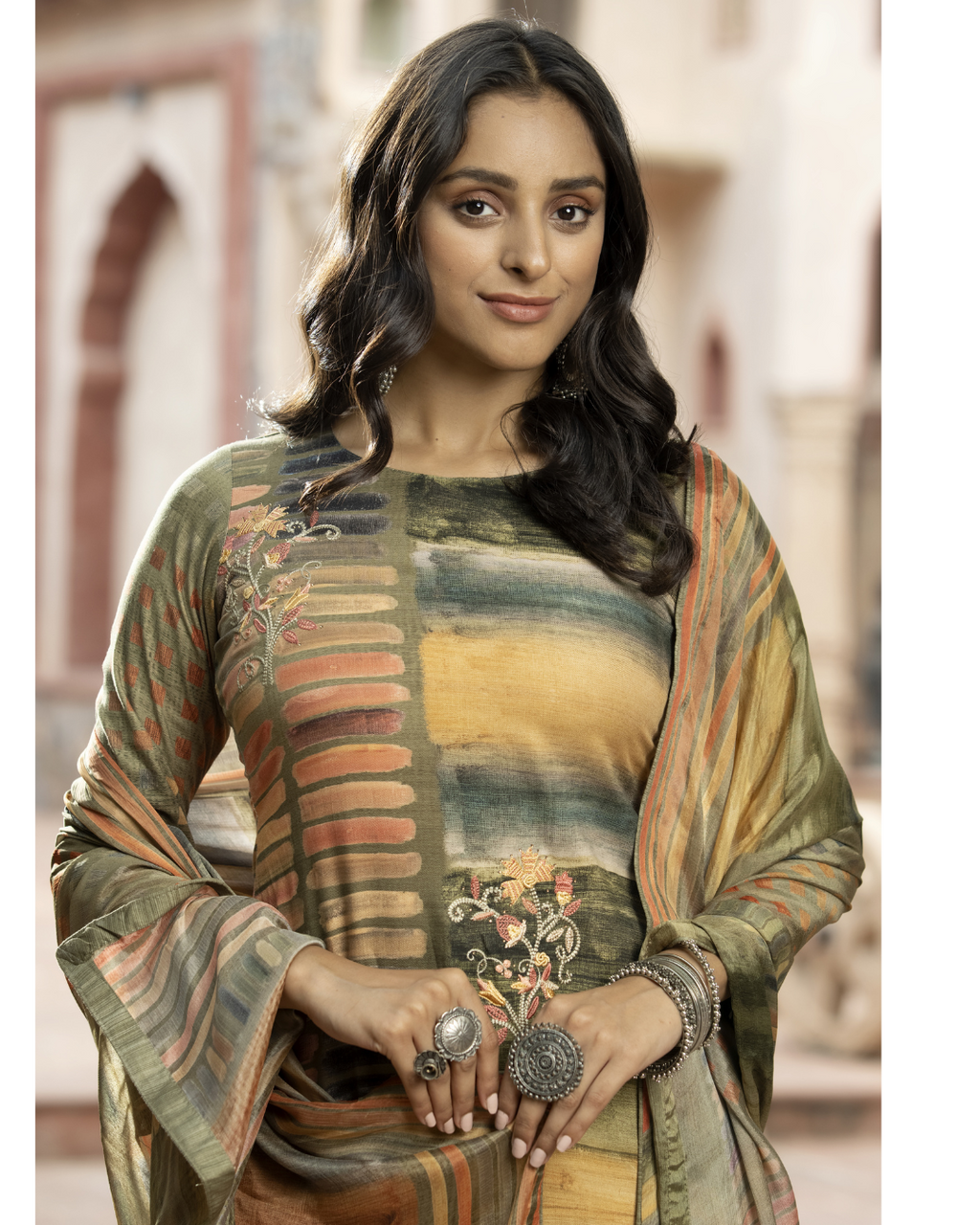 Multi Cottswool Printed with Embroidery Unstitched Suit Set