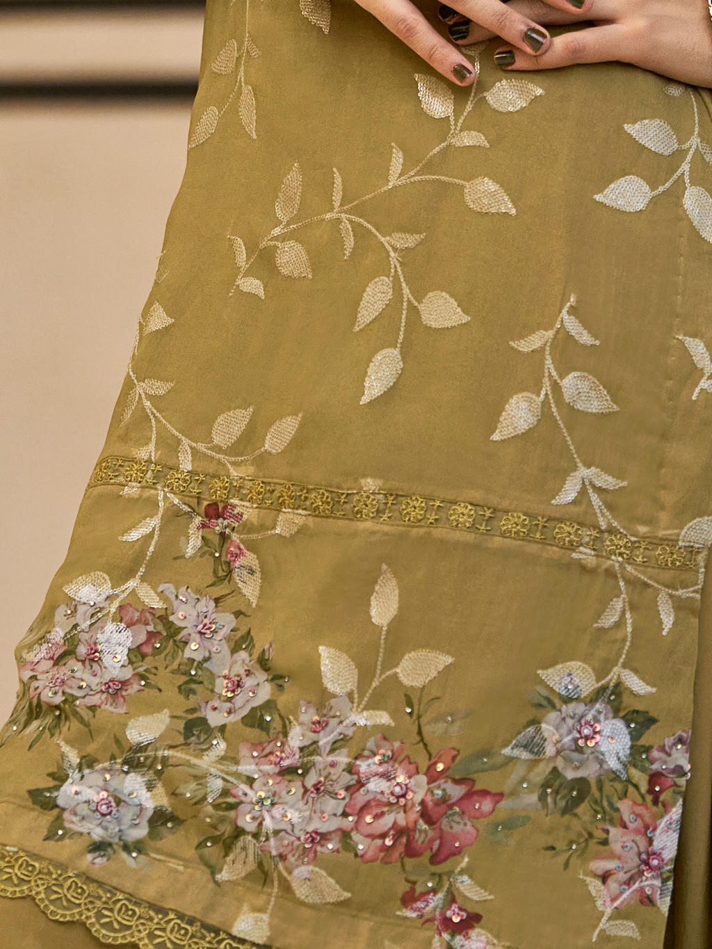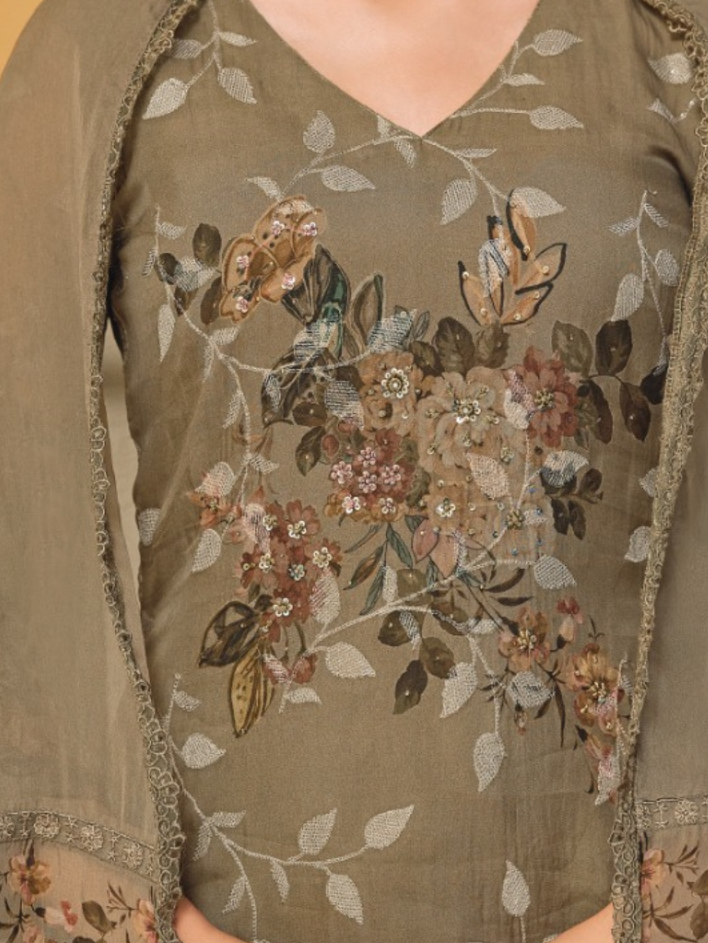 Olive Sequins Embroidered Organza Party Wear Unstitched Suit Set
