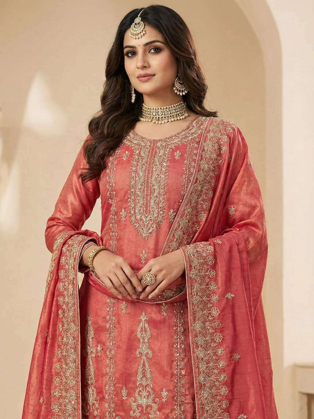Peach Sheen Organza Printed Hand-Embroidered Unstitched Suit Set