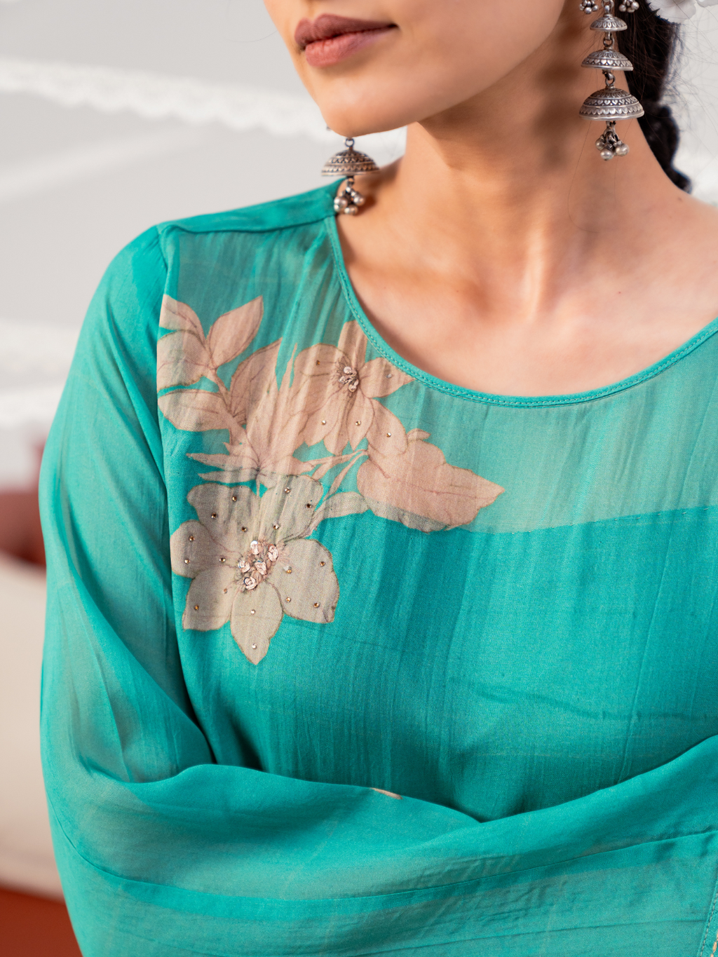 Teal Green Organza Unstitched With Print & Hand Embroidery