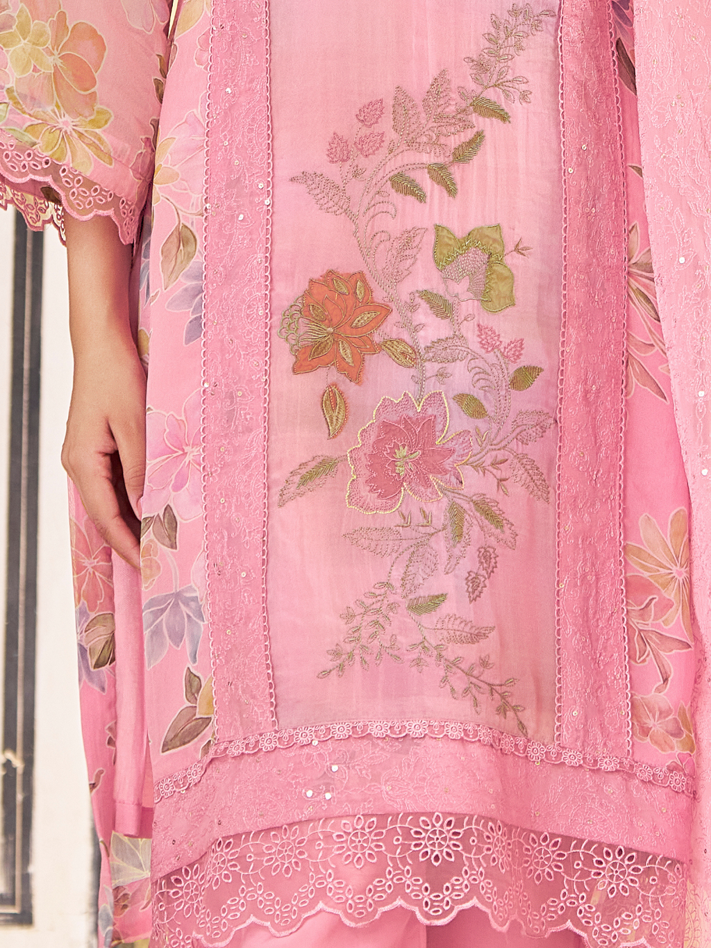 Blush Pink Organza Printed & Sequin-Embroidered Unstitched Suit Set