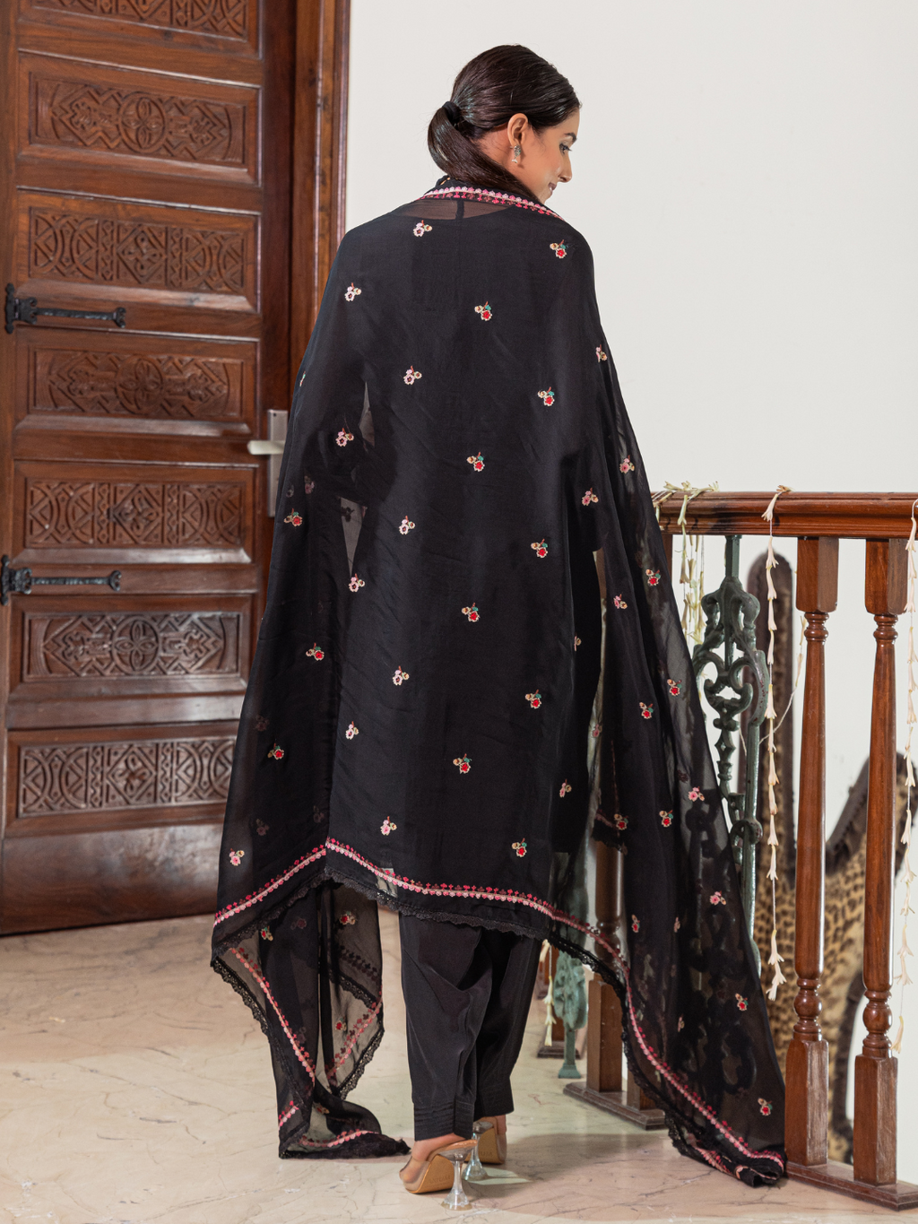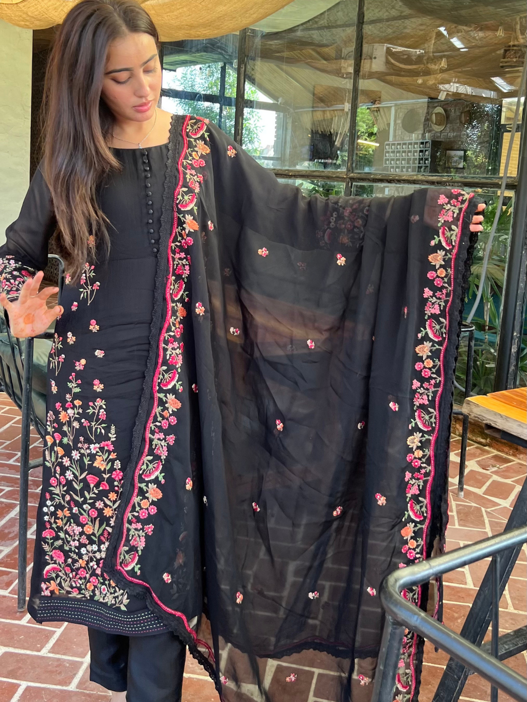 Black Organza Unstitched Suit Multi-Thread Embroidery & Bottom Work