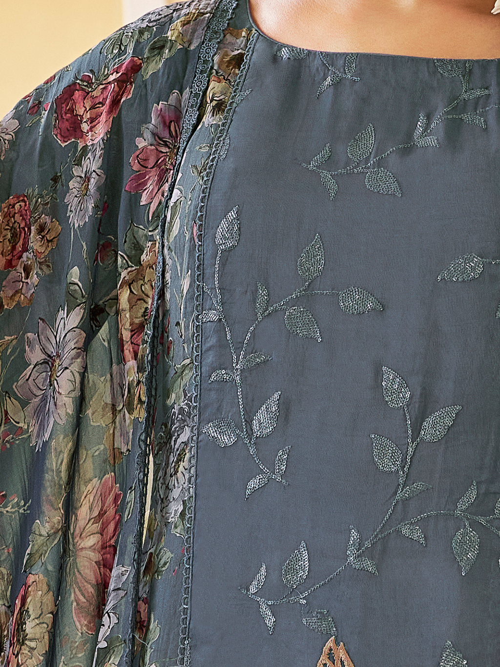 Aegean Teal Organza Printed & Sequin-Embroidered Unstitched Suit Set