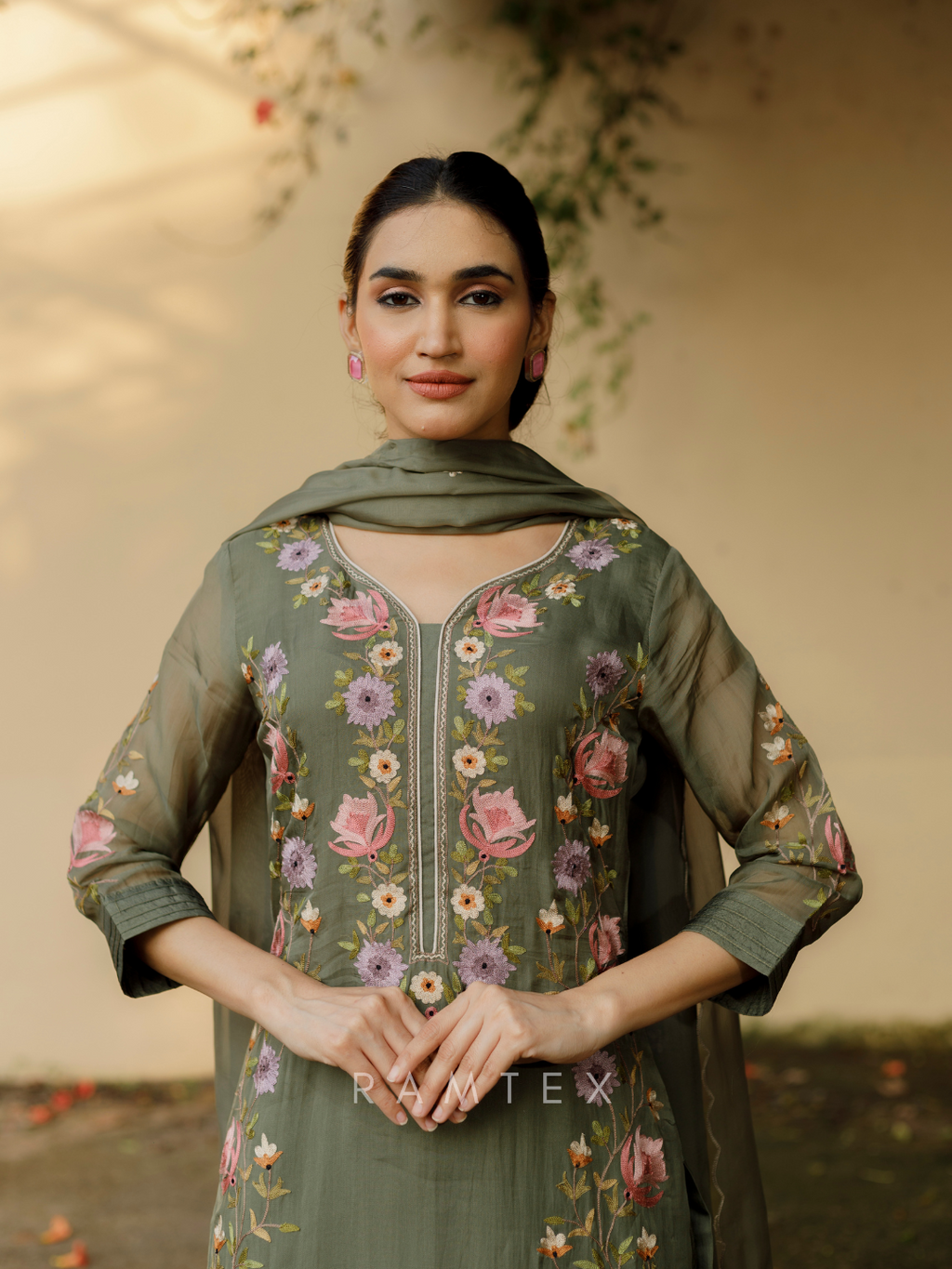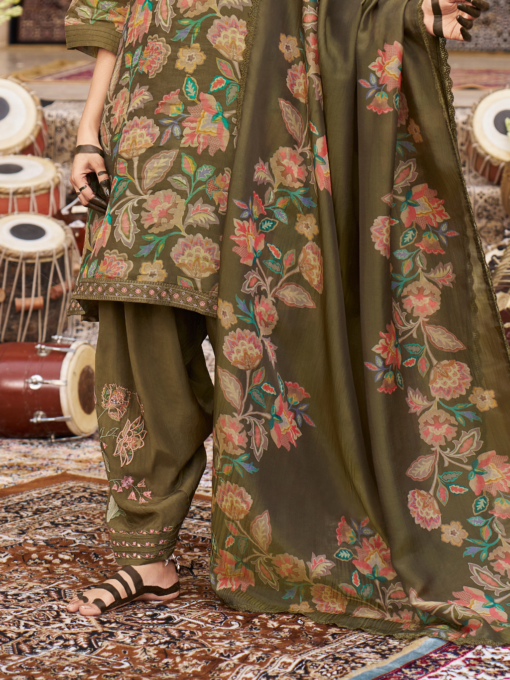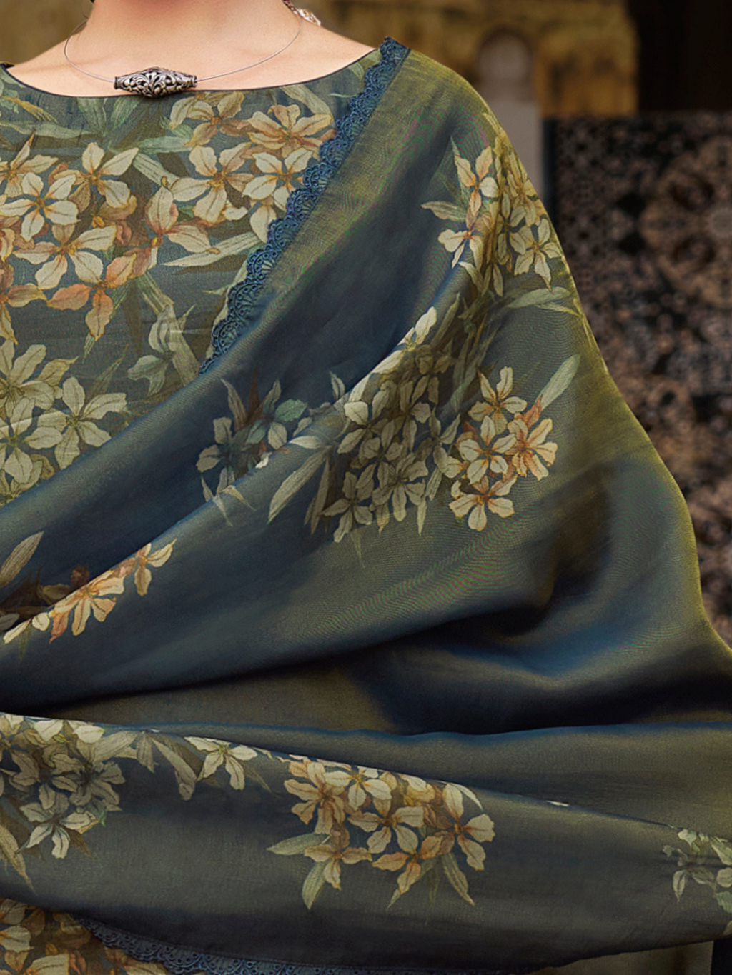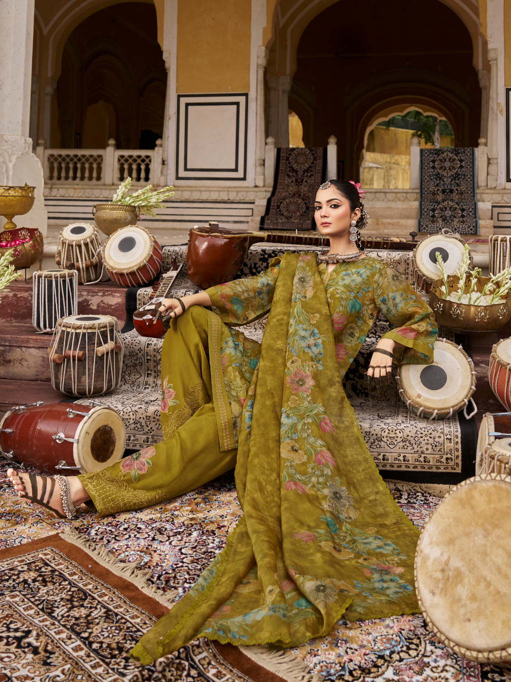 Olive Printed Tissue Organza Unstitched Suit Set with Zari and Intricate Embroidery