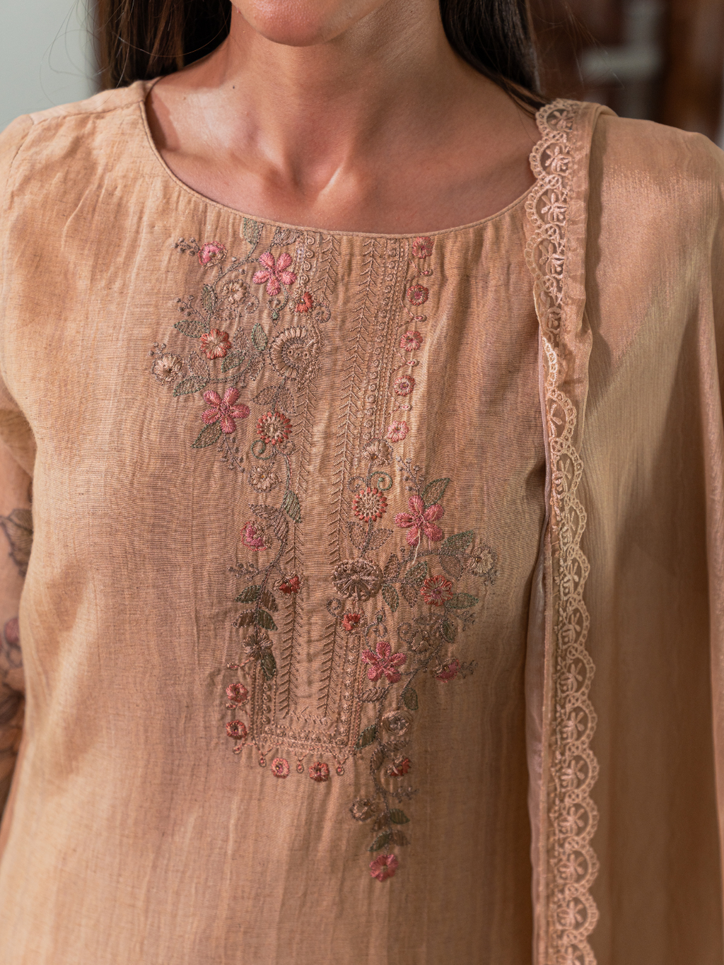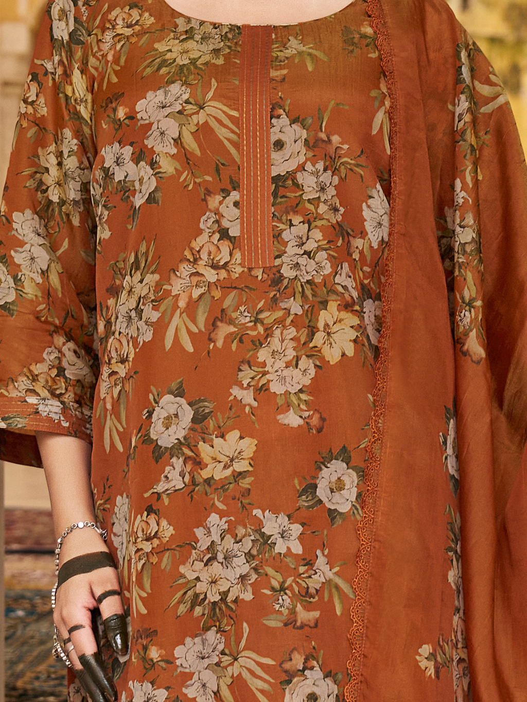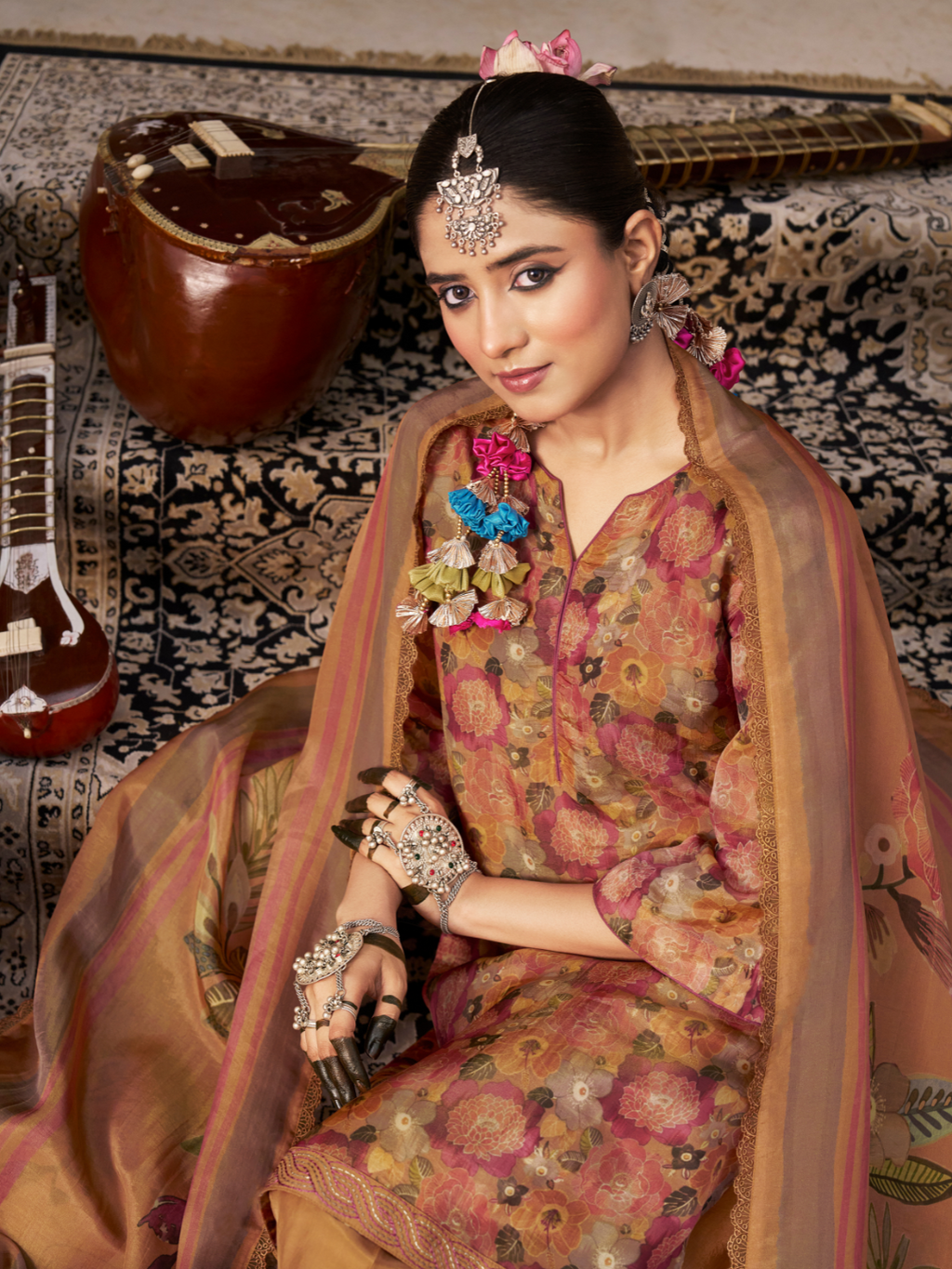Rust Printed Tissue Organza Unstitched Suit Set with Zari and Intricate Embroidery