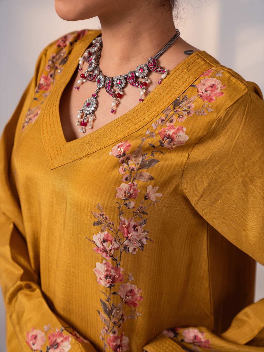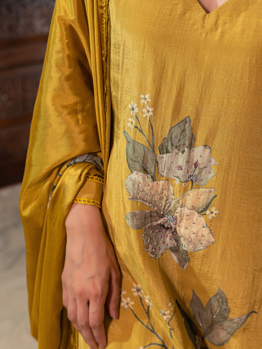 Mustard Printed Tissue Organza Unstitched Suit Set with Zari and Intricate Embroidery