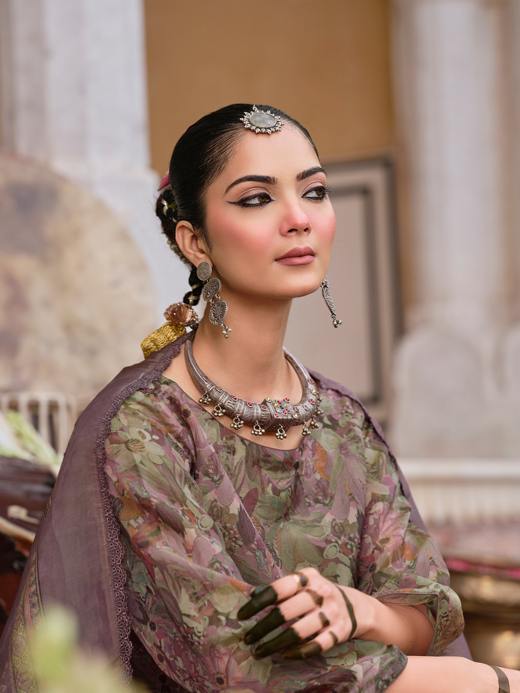Plum Printed Tissue Organza Unstitched Suit Set with Zari and Intricate Embroidery