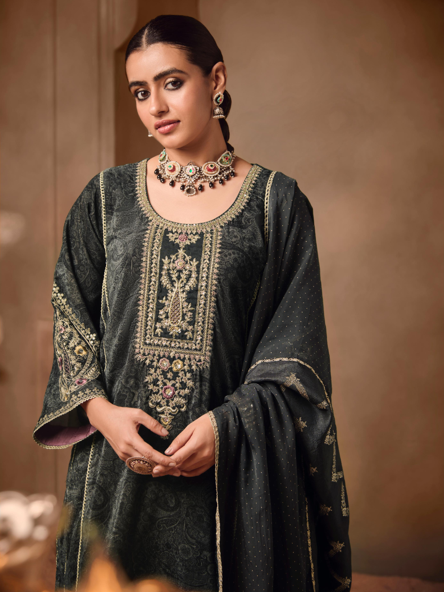 Olive Dusk Kashmiri Print Winter Wear Unstitched Suit Set with Shawl