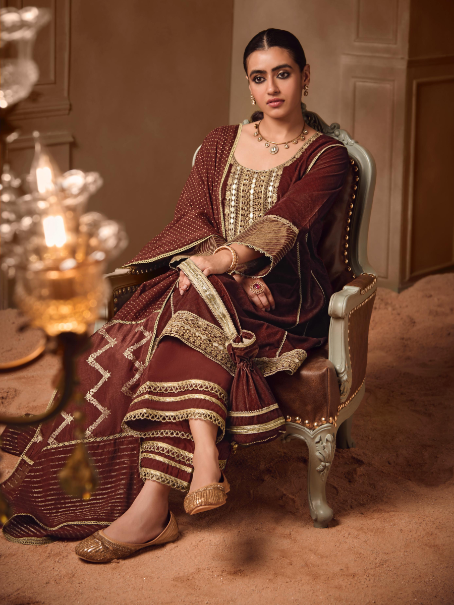 Dark Mocha Kashmiri Print Winter Wear Unstitched Suit Set with Shawl