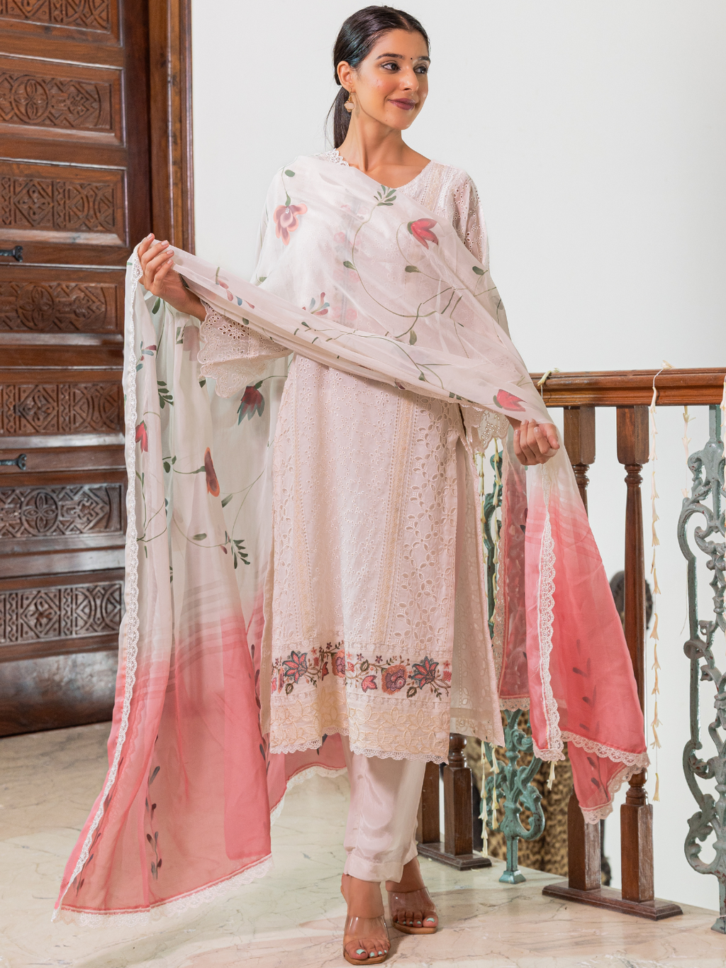White Ivory Georgette Chikankari Unstitched Suit Set with Patch & Zari Work