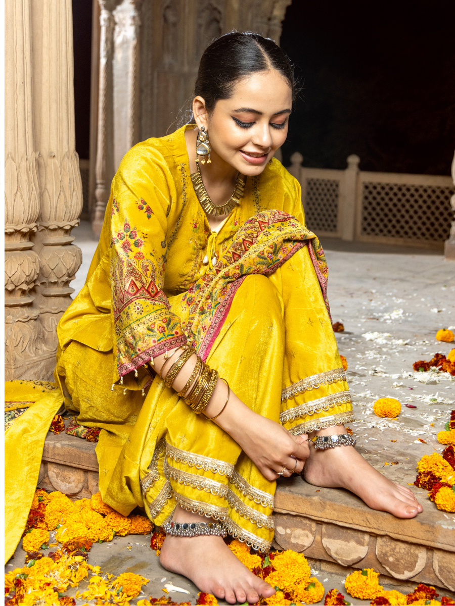 Deep Gold Silk Party Wear Unstitched Suit Set with Heavy Handwork & Aari